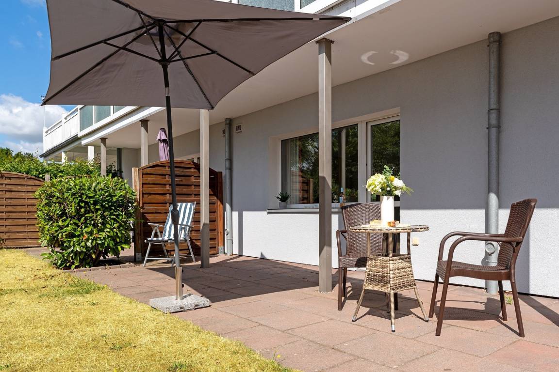 Das 2-Zimmer-Appartement hat ca. 33 m² und bietet Platz für bis zu 4 Personen. Es ist komplett gefliest und verfügt über einen Wohnraum mit: Schlafcouch für 2 Personen, TV-Gerät, Radio/CD-Player, Essplatz, integrierter Küchenzeile sowie einem Zugang zur großzügigen Terrasse mit Gartenmöbeln. Die moderne Küchenzeile ist ausgestattet mit: Induktionsherd (4 Kochplatten), Kühlschrank mit Gefrierfach, Mikrowelle, Geschirrspülmaschine, Wasserkocher, Kaffeemaschine und Toaster. Im Schlafzimmer befinden sich ein Doppelbett (2x 90x200 cm) und ein 2. Zugang zur Terrasse. Duschbad mit Fön.