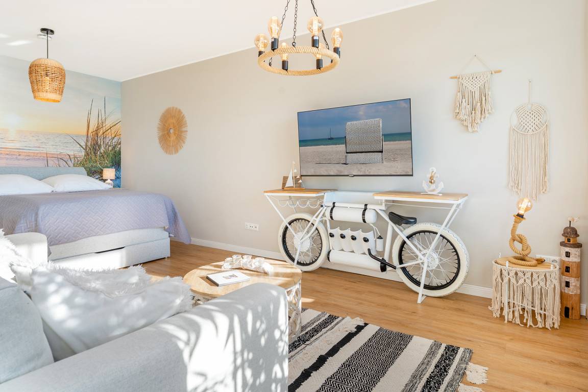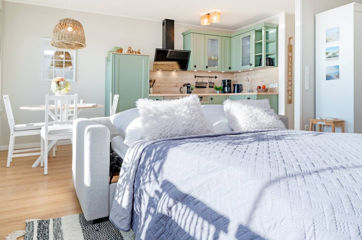 Das stilvolle Loft besticht durch einen offenen Wohn- und Schlafbereich, der mit einem Doppelbett (140x200 cm), einem Schlafsofa (140x200 cm) sowie einem Fernseher gemütlich eingerichtet ist. Große Fenster lassen viel Tageslicht herein und eröffnen einen traumhaften Blick auf das Meer. Der angrenzende Balkon lädt zu entspannten Stunden an der frischen Ostseeluft ein. Die moderne Küchenzeile ist mit Backofen, Geschirrspüler, Kühlschrank, Herd, Kapselmaschine (Nespresso) und weiteren Küchenutensilien bestens ausgestattet. Hier lässt sich nach Herzenslust kochen und am Esstisch gemeinsam genießen. Das Badezimmer verfügt über Dusche, WC und Haartrockner.