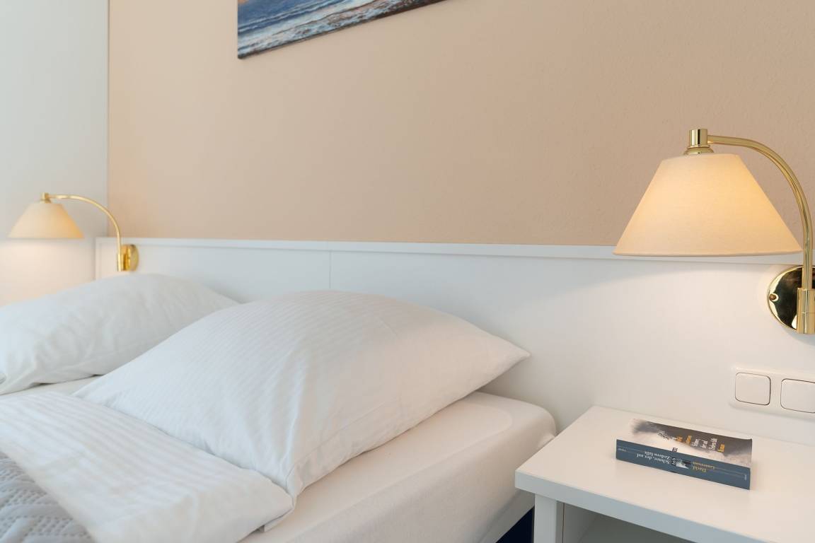 Wohn-/Schlafzimmer: 1 Doppelbett (2x 90x200 cm), wenig Platz für Kinderreisebett, TV, Kleiderschrank, Verdunkelung (Gardinen)
