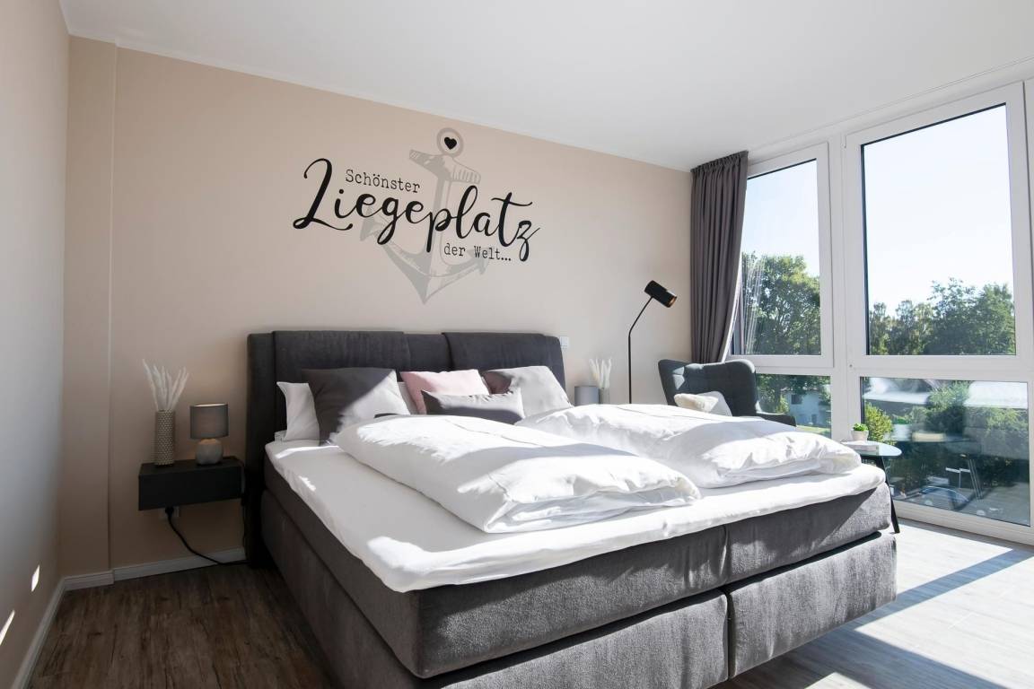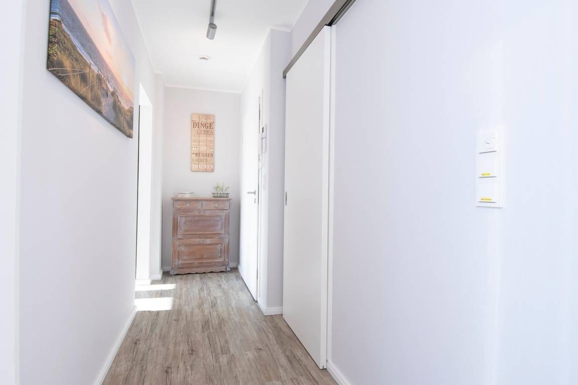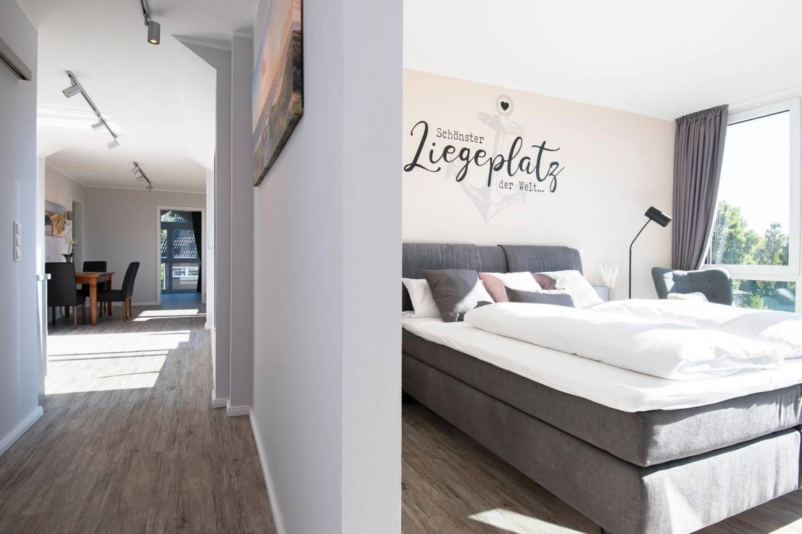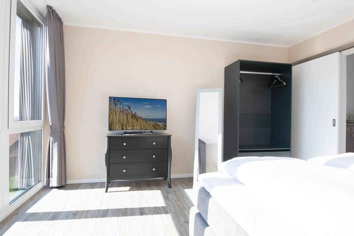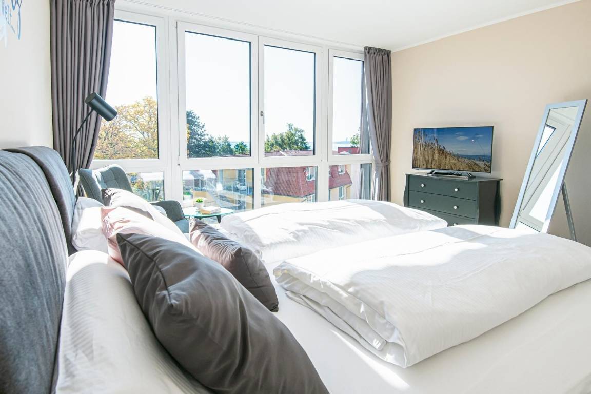 Durch einen ausgefeilten Grundriss ist die Wohnung lichtdurchflutet und überzeugt mit einem Blick auf die Ostsee. Der Eingangsbereich führt direkt in die offene, moderne, voll ausgestattete Küche über, die vis à vis zur Loggia mit Meerblick liegt. Bereiten Sie sich schmackhafte Köstlichkeiten zu und genießen Sie diese direkt auf Ihrem möblierten Balkon, begleitet vom Rauschen des Meeres und Rufen der Möwen. Sollte das Wetter es einmal nicht zulassen, unter freiem Himmel zu essen, steht im Wohnbereich ein Esstisch mit Platz für Vier bereit. Zu spannenden Kinoabenden vor dem Flachbild-TV oder geselligen Spieleabenden lädt Sie im Wohnbereich ein gemütliches Ecksofa zum Kuscheln ein. Loggen Sie sich im kostenlosen WLAN-Netzwerk ein und bleiben Sie auch im Urlaub erreichbar. Im Hauptschlafzimmer mit Flat-TV wartet ein komfortables Boxspringbett (2x 90x200 cm, durchgehender Topper) für erholsame Nächte auf Sie. Dank Verdunkelungsgardinen mit Wärmeschutz kann man hier auch im Sommer angenehm schlafen. Im zweiten separaten Schlafzimmer können sich 2 weitere Urlaubsgäste ebenfalls in die Kissen eines Boxspringbettes (2x 90x200 cm, durchgehender Topper) fallen lassen. Alle Räume, bis auf das kleine Schlafzimmer, lassen sich durch elektrische Außenjalousien verdunkeln. Neue Energie tanken Sie nach einer erfrischenden Dusche im hochwertigen Badezimmer mit Handtuchheizung, Waschmaschine und Föhn. Für angenehme Wärme sorgt eine Fußbodenheizung in der ganzen Wohnung.