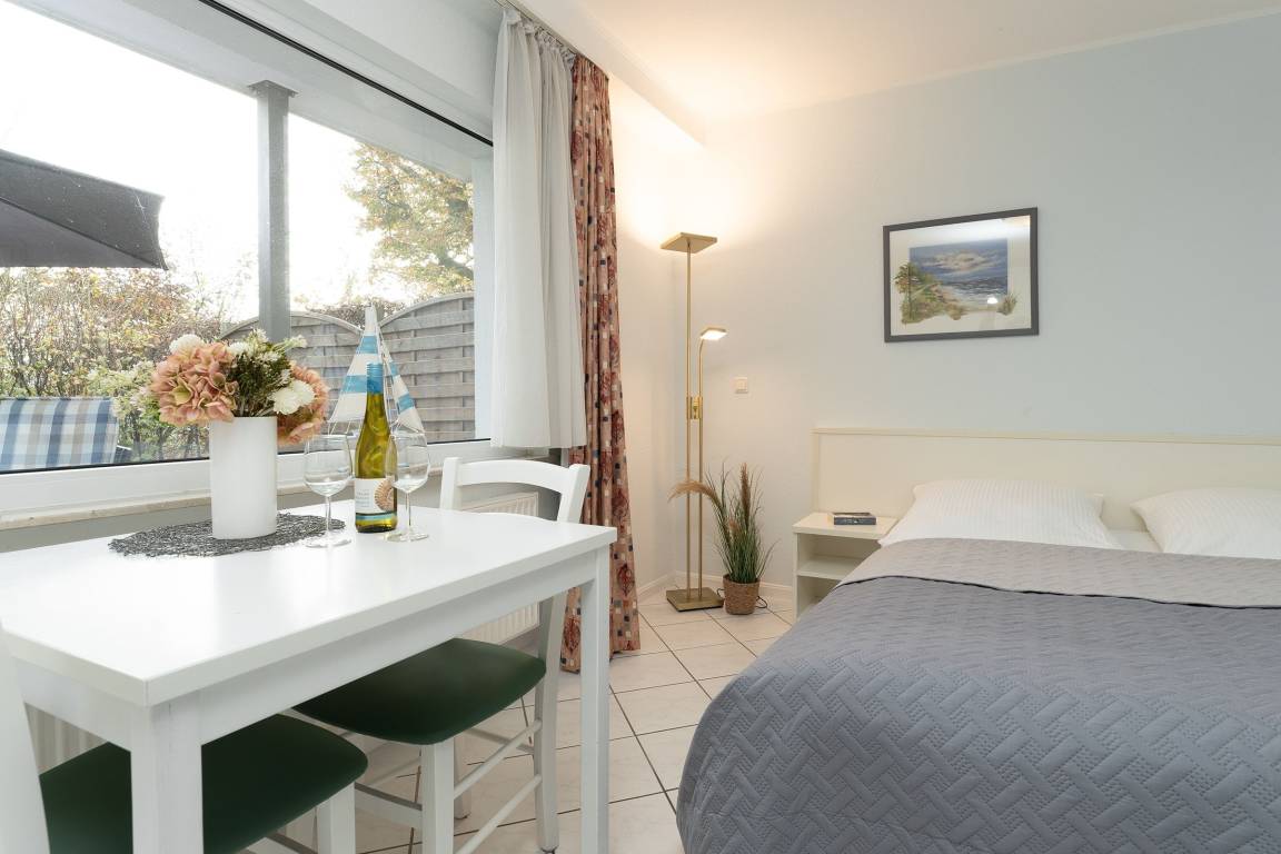 Das 1-Zimmer-Appartement hat ca. 23 m² und bietet Platz für bis zu 2 Personen. Es ist komplett gefliest und verfügt über einen Wohn-/Schlafraum mit einem Doppelbett (2x 90x200 cm), TV-Gerät, Radio/CD-Player, Essplatz, integrierter Küchenzeile sowie einem Zugang zur Terrasse mit Gartenmöbeln. Die moderne Küchenzeile ist ausgestattet mit: Induktionsherd (4 Kochplatten), Kühlschrank mit Gefrierfach, Mikrowelle, Geschirrspülmaschine, Wasserkocher, Kaffeemaschine und Toaster. Duschbad mit Fön.