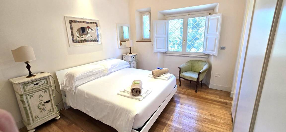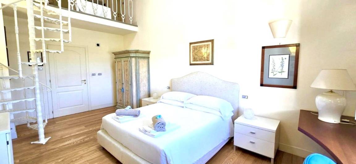 Schlafzimmer mit Bad 1: Doppelbett, WiFi Internet, Klimaanlage, Fliegengitter, Whirlpool-Badewanne, Waschbecken, WC, Bidet, Dusche.