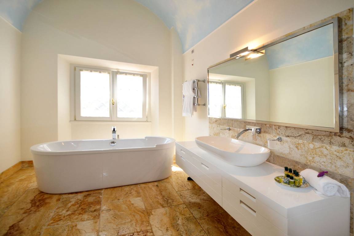 Schlafzimmer mit Bad 3: Doppelbett, zwei Einzelbetten, WiFi Internet, Klimaanlage, Fliegengitter, Waschbecken, WC, Bidet, Badewanne, Dusche.