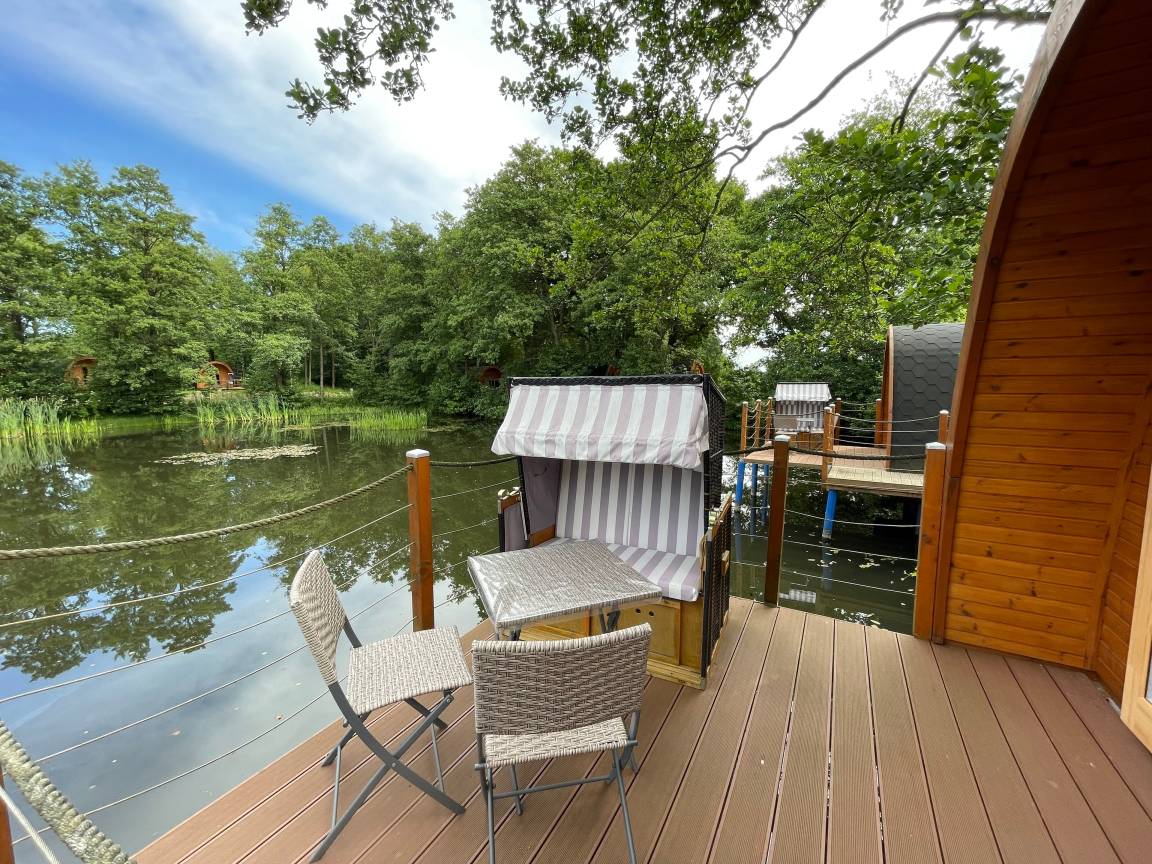 Der Pod ist mit einem eigenen Duschbad inkl. WC und Waschbecken, einem bequemen Doppelbett, einem Sofa was auch gleichzeitig eine weitere Schlafmöglichkeit sein kann, einem Esstisch mit zwei Stühlen, Ablageflächen, einem LCD Flachbildfernseher, Geschirr, Besteck, Wasserkocher und einen Kühlschrank mit kleinem Gefrierfach ausgestattet. Egal ob Frühling, Sommer, Herbst oder Winter, der Pod steht für Sie immer zur Verfügung. Durch eine elektrische Heizung mit Kaminfeuereffekt, sind auch die kalten Tage gemütlich warm zu verbringen. Auf der Terrasse, ausgestattet mit Stühlen, einem Tisch und einem angrenzenden Strandkorb (saisonal) können Sie Ihr schönes Frühstück mit Blick aufs Wasser oder Abends bei Sternenhimmel einfach genießen.