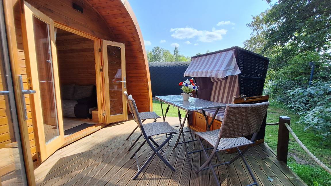 Der Hauptpod ist mit einem eigenen Duschbad inkl. WC und Waschbecken, einem bequemen Doppelbett, einem Sofa was auch gleichzeitig eine weitere Schlafmöglichkeit sein kann, einem Esstisch mit zwei Stühlen, Ablageflächen, einem LCD Flachbildfernseher, Geschirr, Besteck, Wasserkocher und einen Kühlschrank mit kleinem Gefrierfach ausgestattet. Der Mini-Pod ist mit 2 Betten je 80x200cm, 2 Stühlen, einer Kommode ausgestattet. Egal ob Frühling, Sommer, Herbst oder Winter, der Pod steht für Sie immer zur Verfügung. Durch eine elektrische Heizung mit Kaminfeuereffekt, sind auch die kalten Tage gemütlich warm zu verbringen. Auch der Mini-Pod besitzt eine kleine Heizung. Auf der Terrasse, ausgestattet mit Stühlen, einem Tisch und einem angrenzenden Strandkorb (saisonal) können Sie Ihr schönes Frühstück mit Blick aufs Freie oder Abends bei Sternenhimmel einfach genießen.