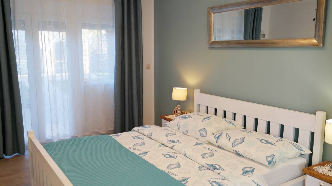 Im ersten Stock befinden sich drei Schlafzimmer und ein Badezimmer mit Badewanne und Waschmaschine. Zwei Schlafzimmer sind mit Doppelbetten und ein Schlafzimmer mit zwei Einzelbetten ausgestattet. Jedes Zimmer hat Klimaanlage und Sat-TV. Im ersten Stock befindet sich auch ein Balkon (25 m²), zwei Schlafzimmer haben einen Ausgang auf den Balkon. Ab 2022 hat das Haus einen Swimmingpool mit einer Größe von 25 m² (Größe 6,60 x4,00 m, Tiefe 1,35 m). Beim Haus ist ein Parkplatz. Das Haus befindet sich nur 100 m vom Geschäft und 200 m vom Restaurant entfernt. Ebenfalls nur 150 m vom Haus entfernt befindet sich der moderne Fitnessraum, der das ganze Jahr über genutzt werden kann (nicht im Preis inbegriffen).