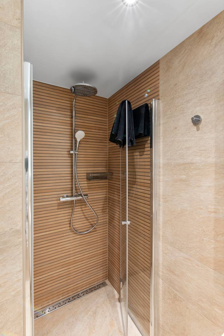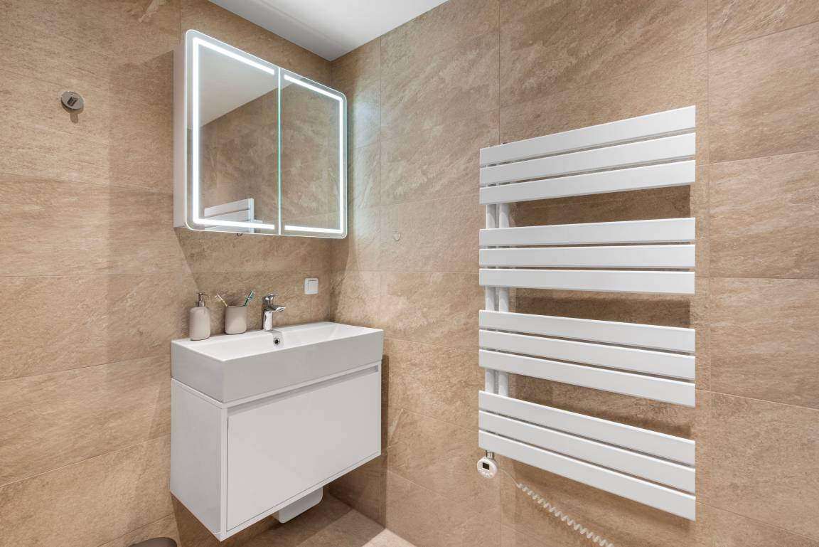 Duschbereich, Heizkörper, Handtuchhalterungen, Haartrockner