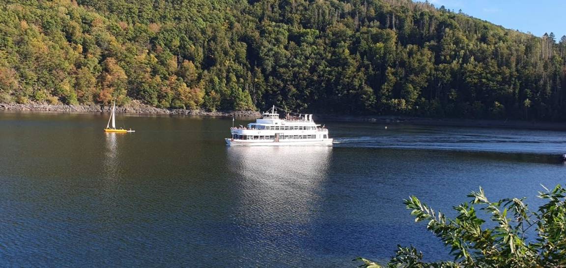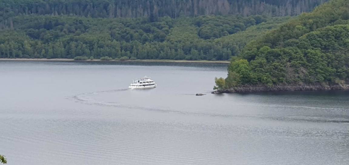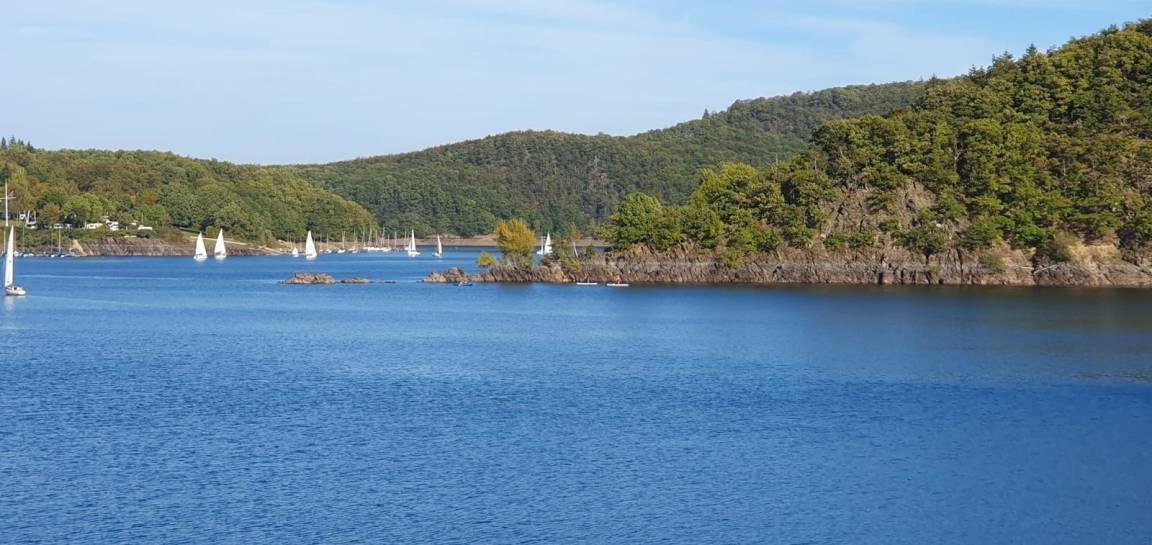 den Rursee. Gerahmt von eindrucksvoller Natur und eifeler Gebirgen erstreckt sich der Rursee am Fuße des Hangs, den
