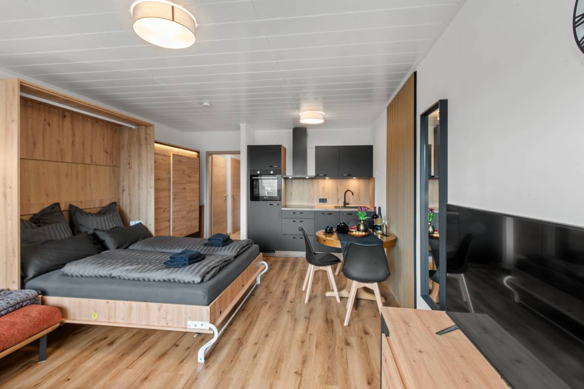 WLAN, komfortables Schrankbett mit hochwertigen Matratzen, großzügiger Kleiderschrank, ausziehbarer Esstisch (Holz),