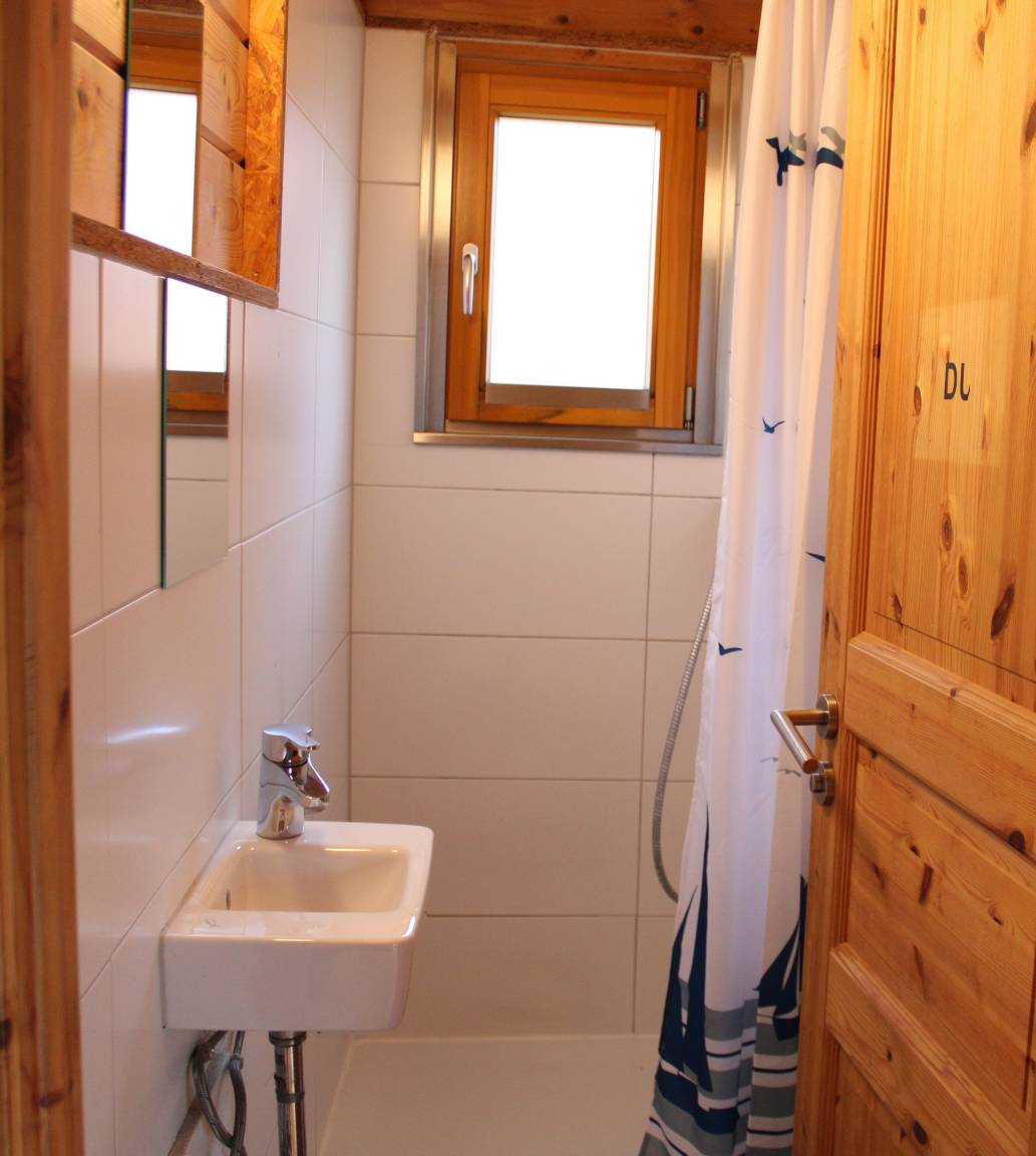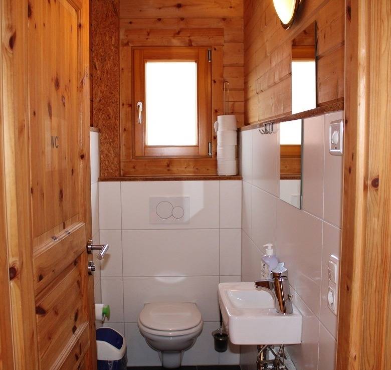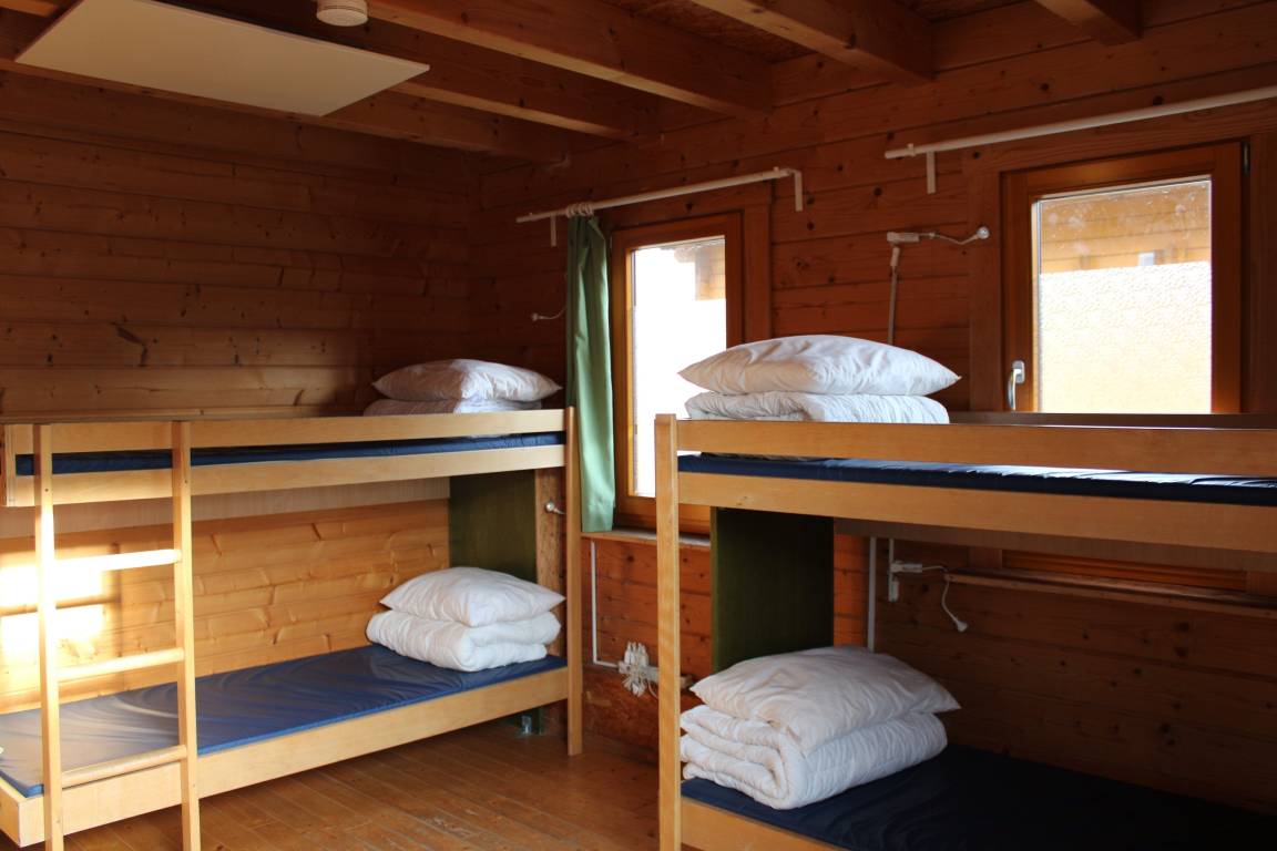 Das Blockhaus besteht im Erdgeschoss aus einem Aufenthaltsbereich mit kleiner Kochzeile, getrennten Räumen mit WC und Dusche, einem Doppel- und einem Vierbettzimmer (Doppelstockbetten) sowie im Dachgeschoss aus einer offenen Empore mit 6 Betten. Das Haus ist zweckmäßig und schlicht eingerichet.