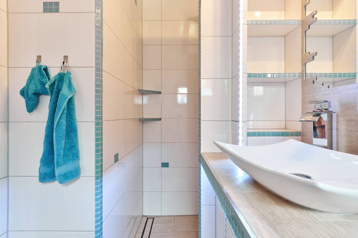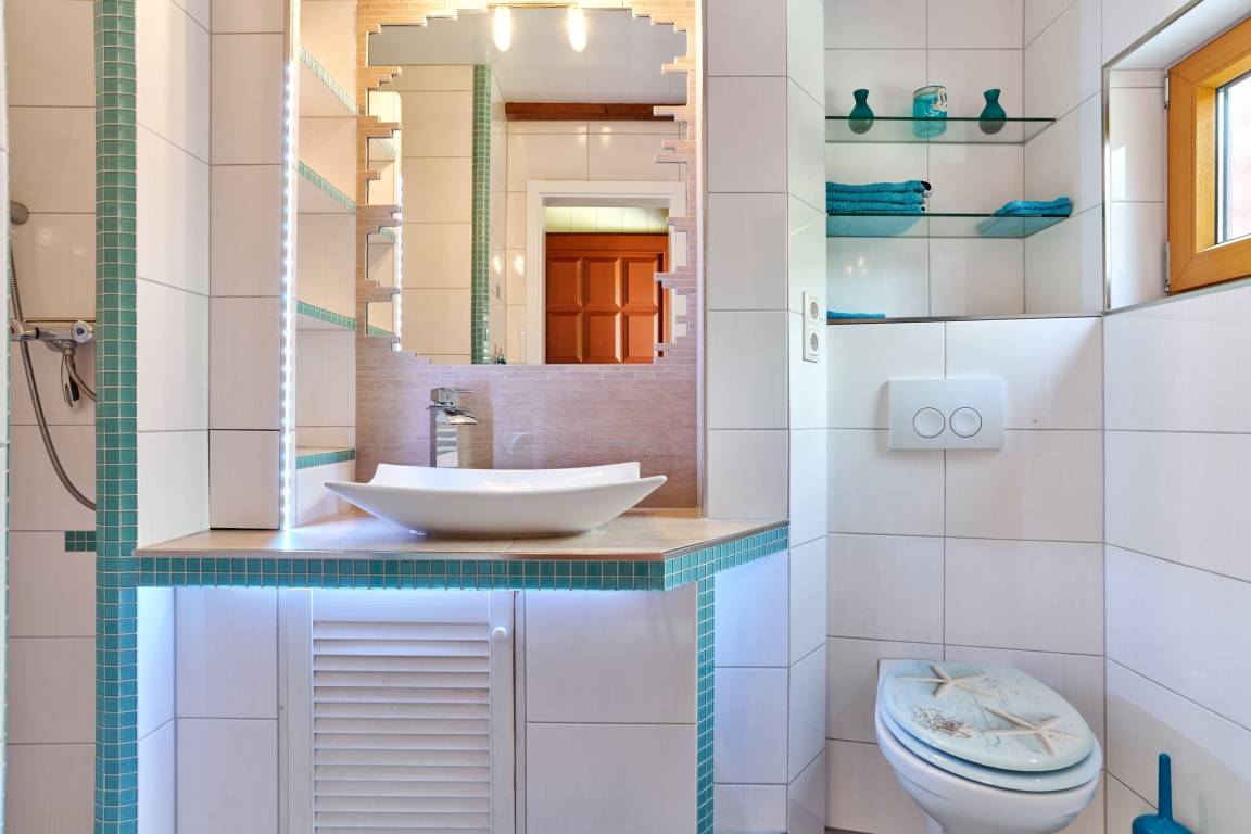modern gestaltet und verfügt über eine bodengleiche Dusche, während die voll ausgestattete Küche mit Speisekammer