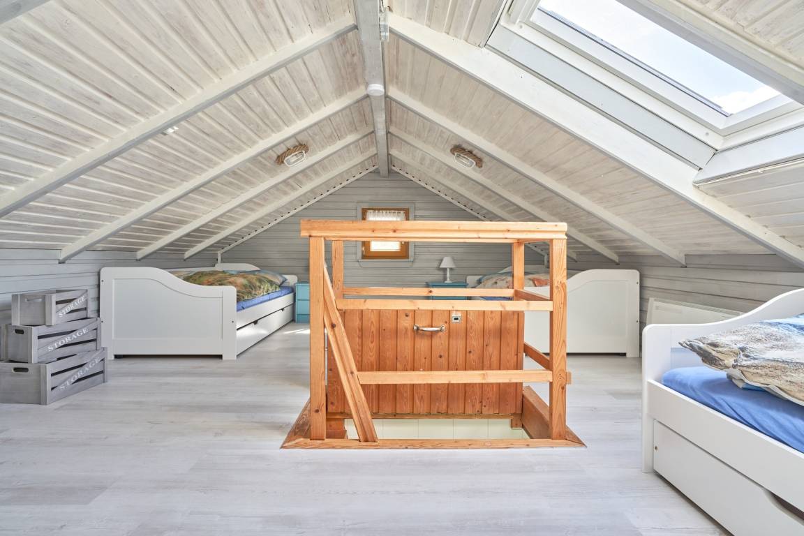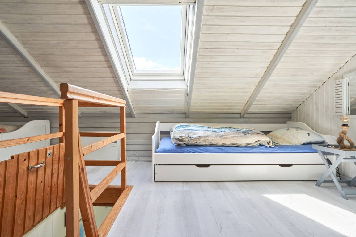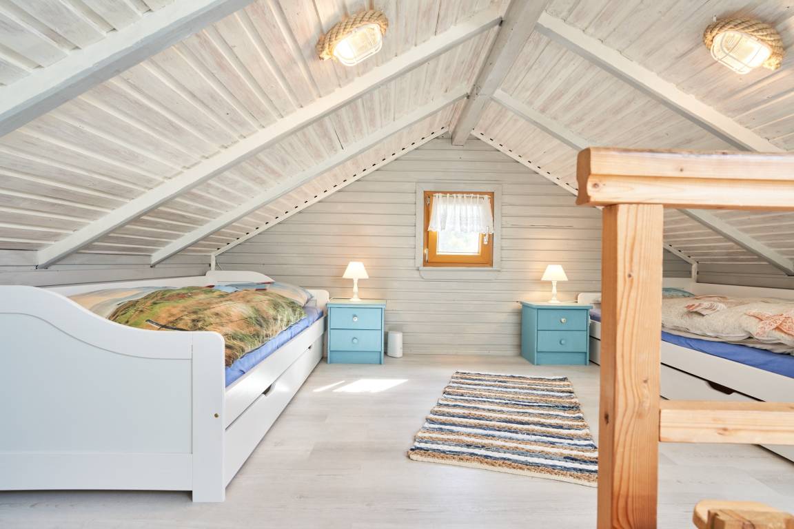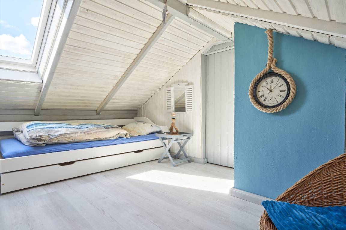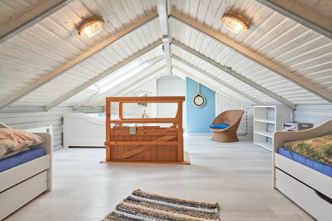 oder Eltern. Über eine steile Treppe im Dachgeschoss erreicht man das „hyggelige" Kinderzimmer mit drei Einzelbetten, das