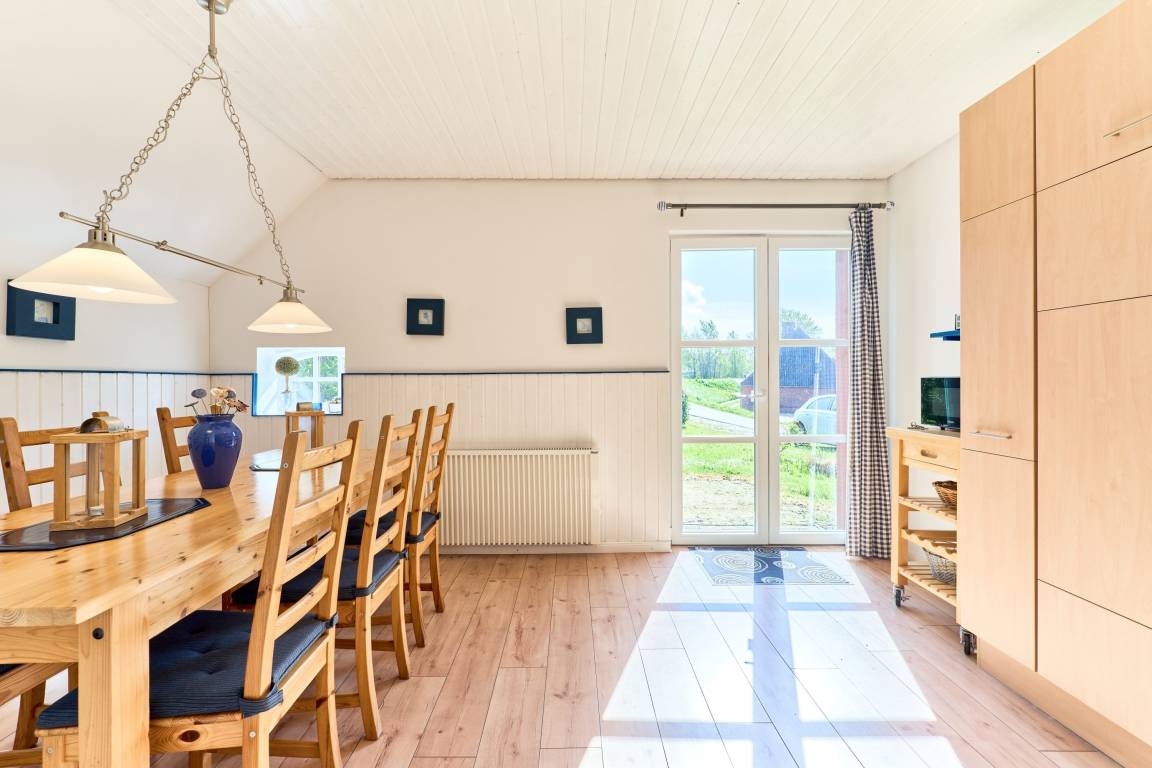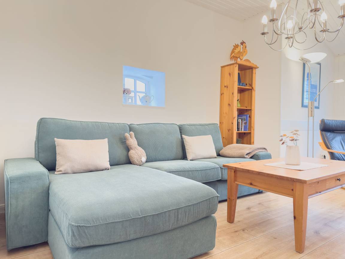 Der geschmackvoll eingerichtete Wohnbereich mit bequemen Sofas und Flachbildfernseher lädt zu gemütlichen Stunden ein – ob bei einem Spieleabend oder nach einem Tag an der frischen Nordseeluft. Die großzügige Küche mit Esstisch ist das Herzstück der Wohnung und bietet viel Platz für gemeinsame Mahlzeiten und lange Abende in geselliger Runde.