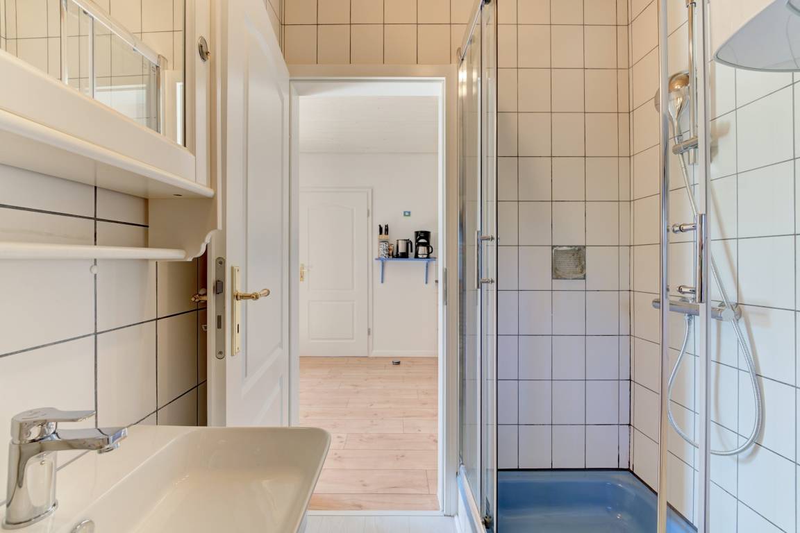 Im Erdgeschoss befindet sich außerdem ein modernes Duschbad mit WC sowie eine Waschmaschine – praktisch für längere Aufenthalte oder den Urlaub mit Hund.