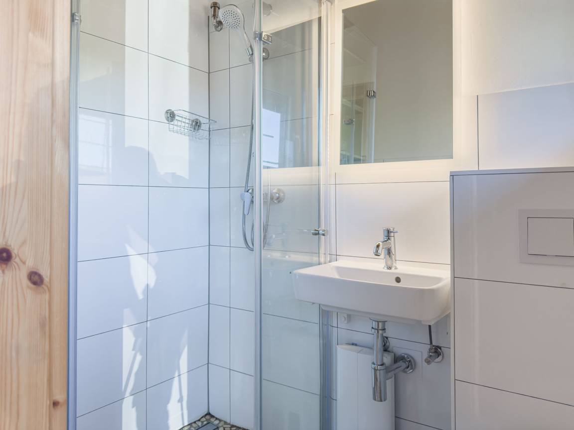bodengleicher Dusche und Fußbodenheizung sowie der helle Wohn- und Küchenbereich mit allen Annehmlichkeiten