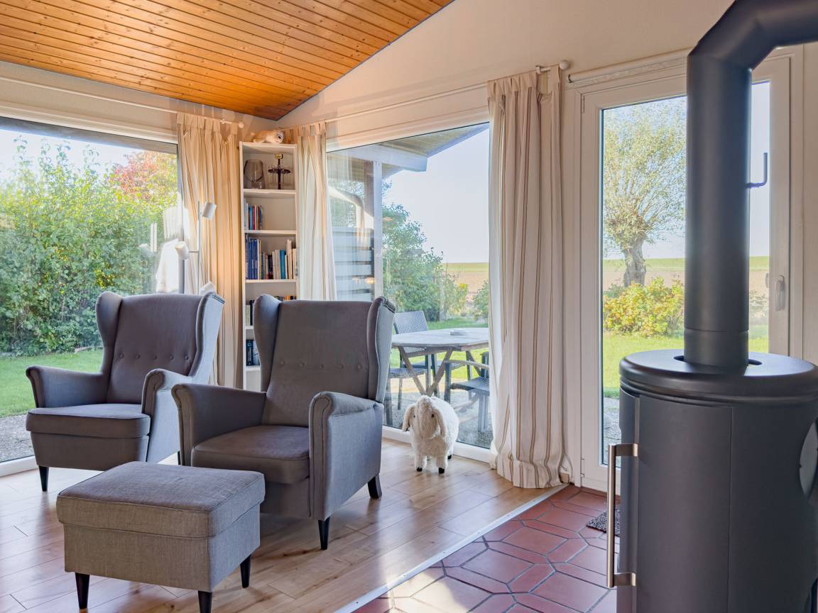 Der Wohnbereich mit Sofa und Kaminofen lädt dazu ein, es sich gemütlich zu machen, während