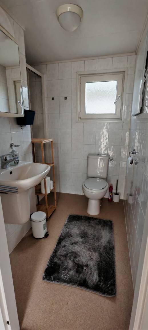 Das großzügige Bad bietet eine Dusche, WC und Waschbecken.