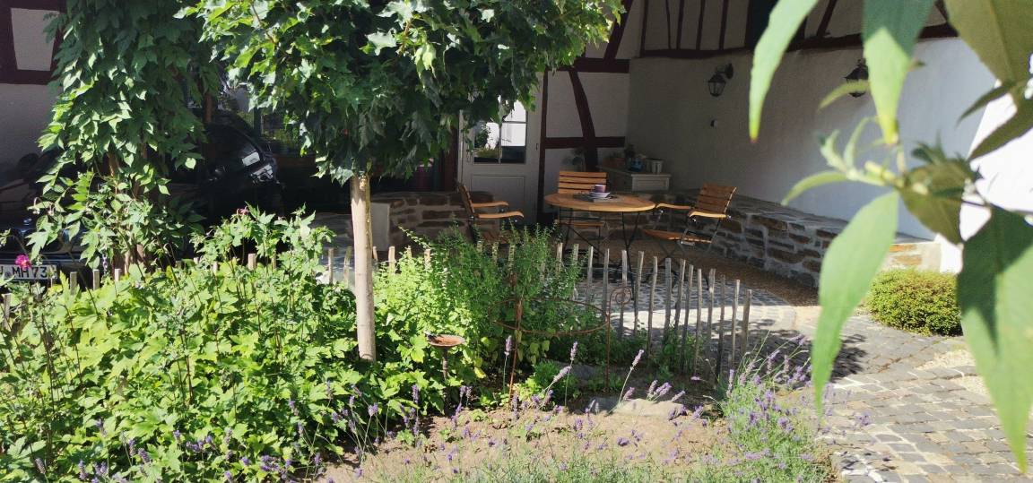 Auch bei regnerischem Wetter lädt der liebevoll gestaltete Innenhof zu gemütlichen Stunden ein, da ein Teil der Sitzecke überdacht ist. Der Innenhof wird zur Mitbenutzung angeboten.