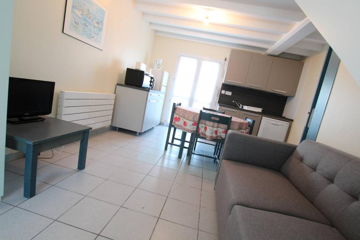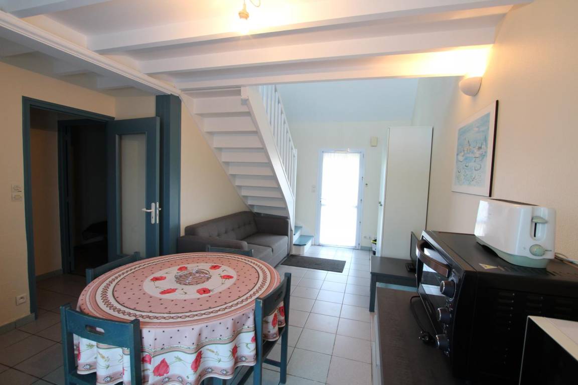 Doppelhaushälfte. Erdgeschoss: Wohnzimmer (festes Sofa, TV) mit Kochnische (Geschirrspüler), Schlafzimmer 1 (1 Doppelbett), Duschbad mit WC. Obergeschoss: Mezzanine (1 Einzelbett), Schlafzimmer 2 (2 Einzelbetten). Bettwäsche und Handtücher können gemietet werden. Reinigungsservice gegen Aufpreis pro Stunde. WLAN-Internetzugang. Elektroheizung inklusive. Babyausstattung auf Anfrage. Kleiner privater Außenbereich. 2 gemeinschaftliche Grillplätze und ein individueller Grill auf Anfrage und je nach Verfügbarkeit. Gartenmöbel. Parkplatz. Vor Ort: Bouleplatz, Tennisplatz und Multisportplatz, Kinderspiele. Wäscheservice auf Anfrage vor Ort (18 € Paket 1 Waschen + 1 Trocknen).