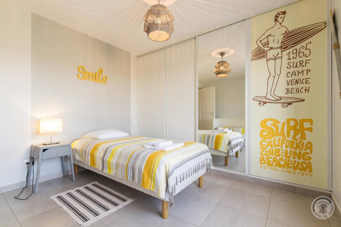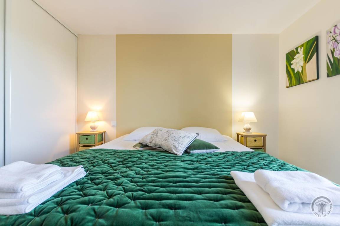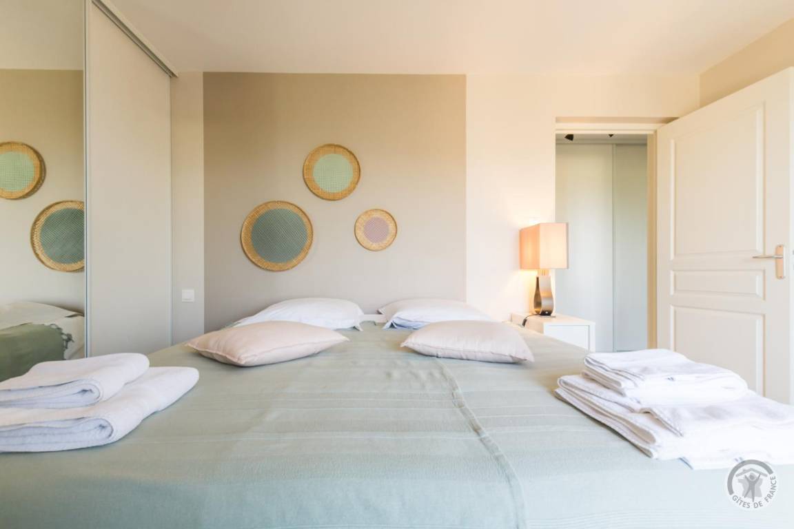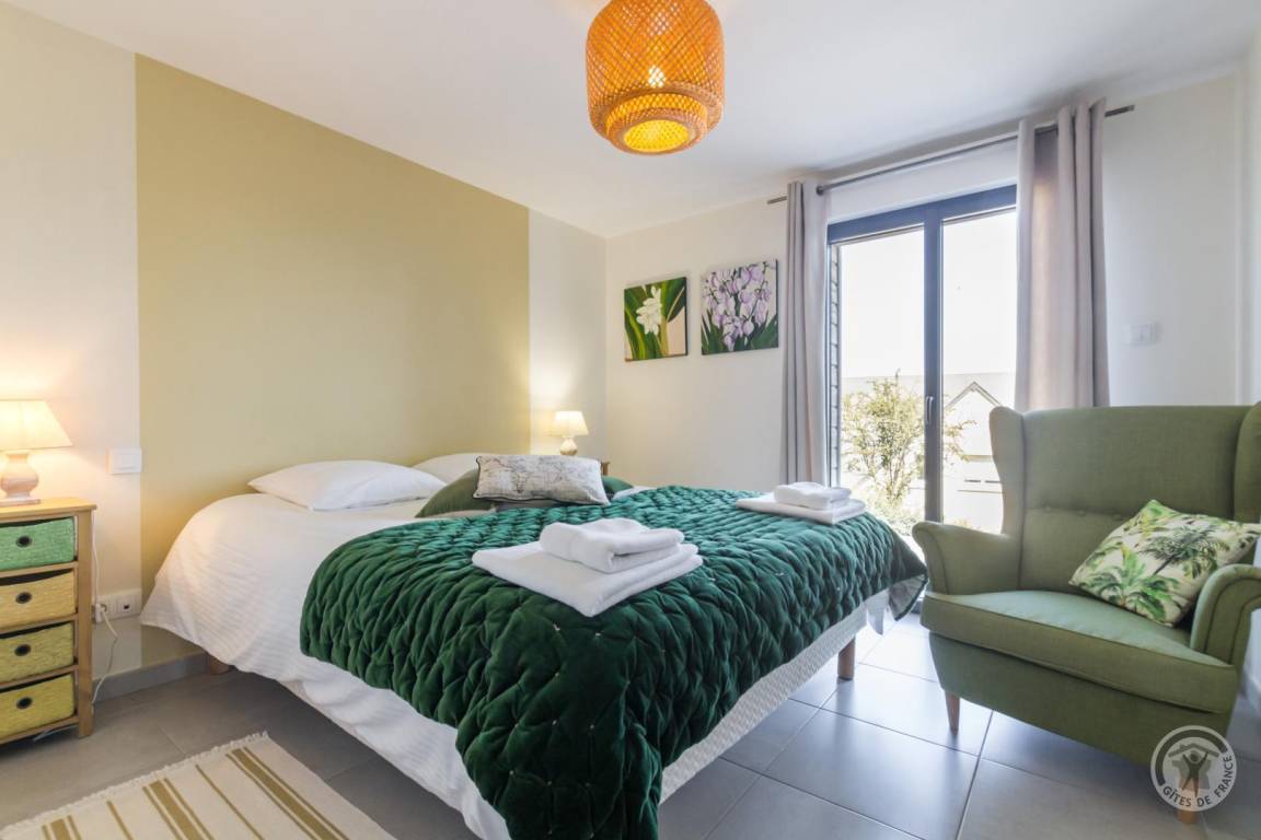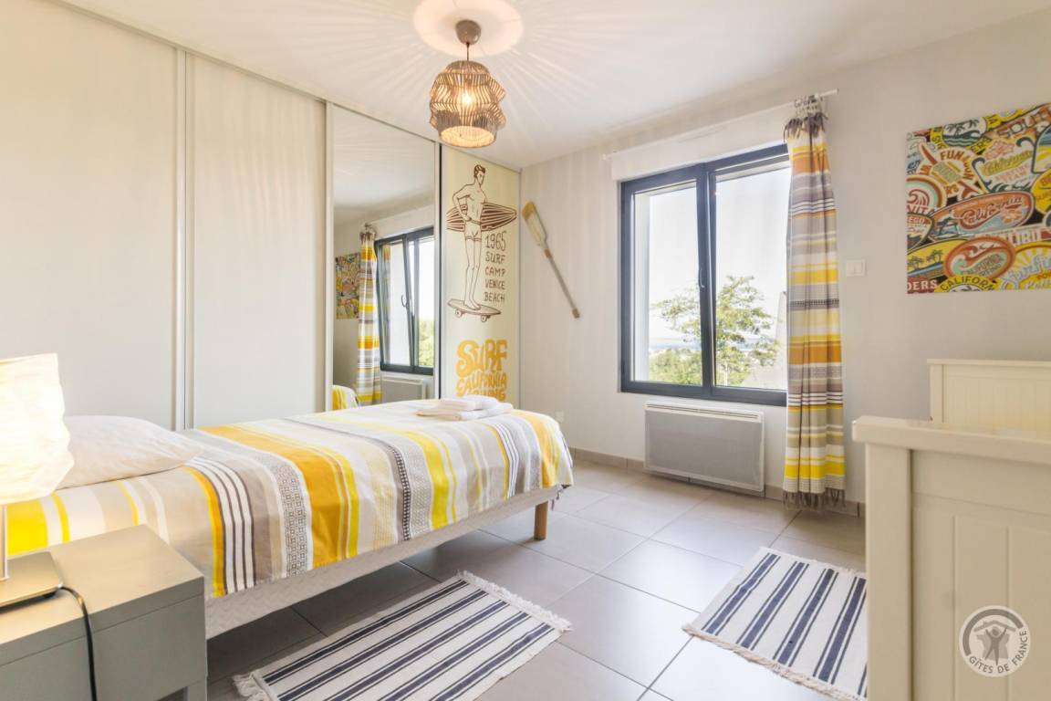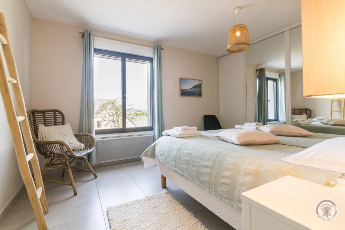 „Bon accueil avec petit cadeau à l'arrivée. Gîte très propre, bien équipé, bonne literie. Grande terrasse qui doit être bien agréable aux beaux jours. A 1,2 km de la grande plage, permettant d'agréables promenades et toutes les activités de mer. Sans trop de monde. Nous avons passé de bonnes vacances. Par grosse chaleur, la pièce du haut peut être un peu chaude, car la grande fenêtre offrant la vue sur la mer ne dispose pas de volet.“