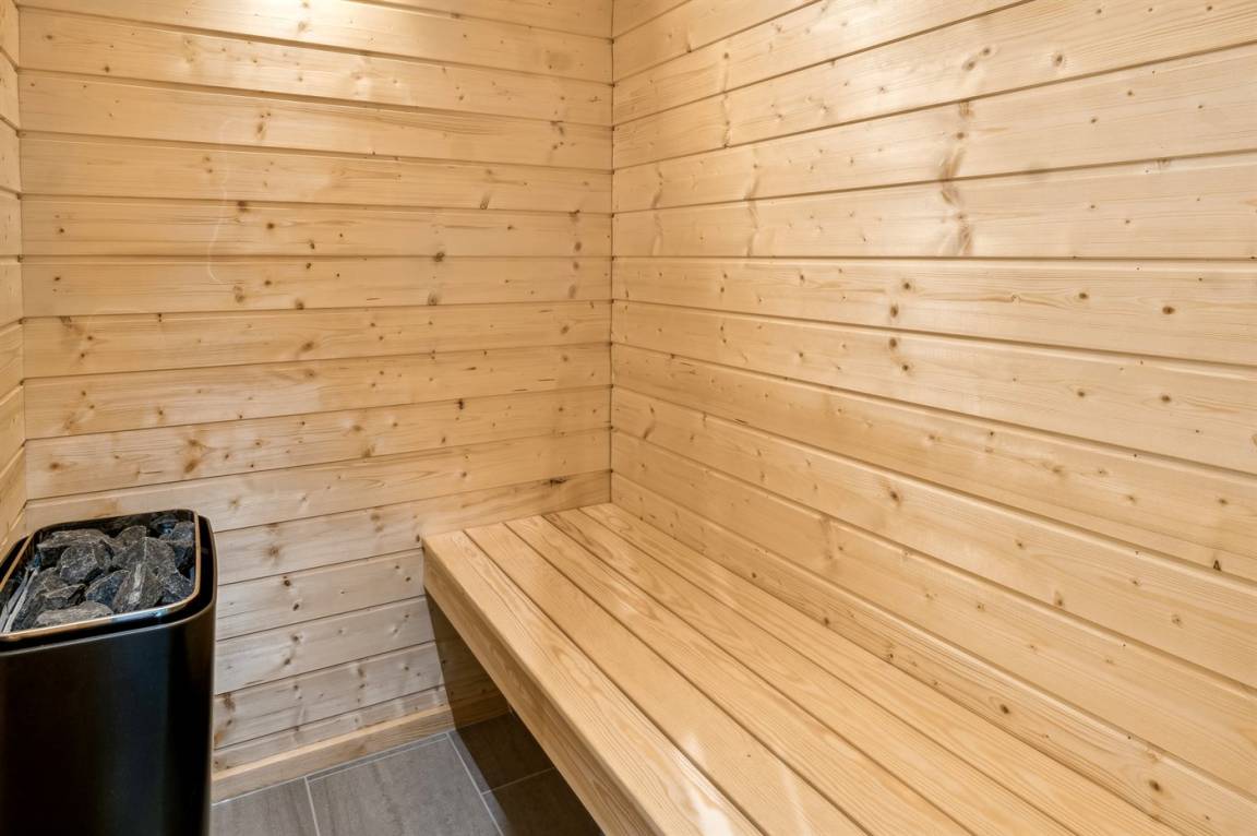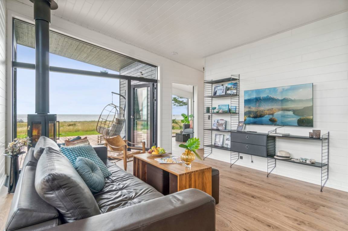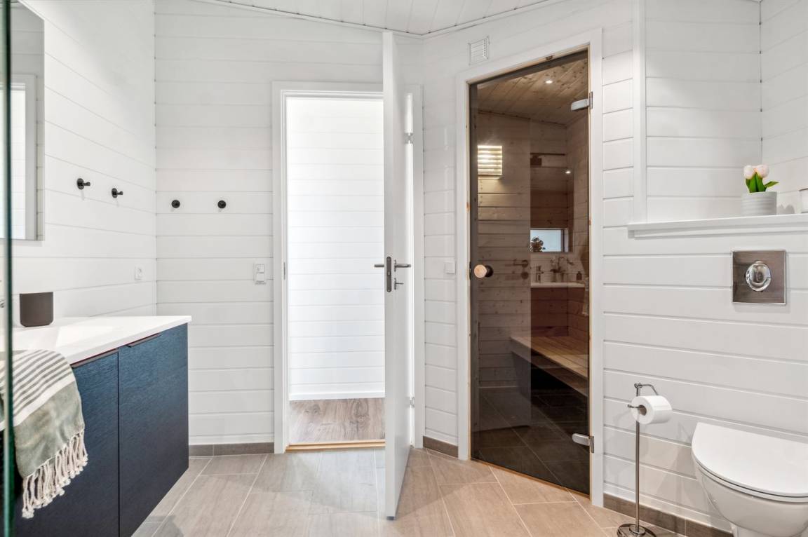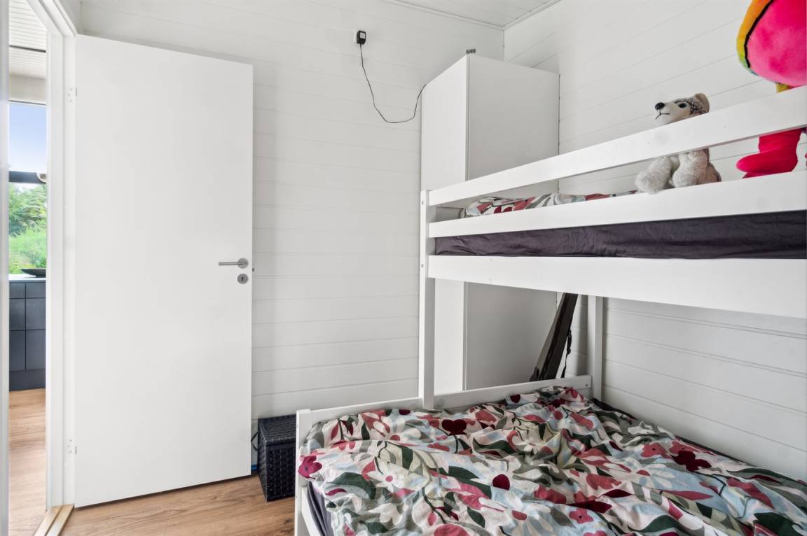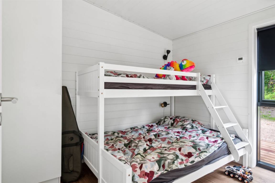 Es gibt vier Schlafzimmer, von denen zwei mit Doppelbetten ausgestattet sind. Ein Schlafzimmer hat ein Etagenbett mit insgesamt drei Schlafplätzen, und im nach Norden ausgerichteten Zimmer mit vollem Meerblick, das auch als gemütlicher Bereich im Wohnzimmer dient, gibt es ein Schlafsofa für zwei Personen. Es gibt zwei Badezimmer mit Fußbodenheizung, im größeren davon zusätzlich Spa, Sauna und eine kombinierte Waschmaschine/Trockner.