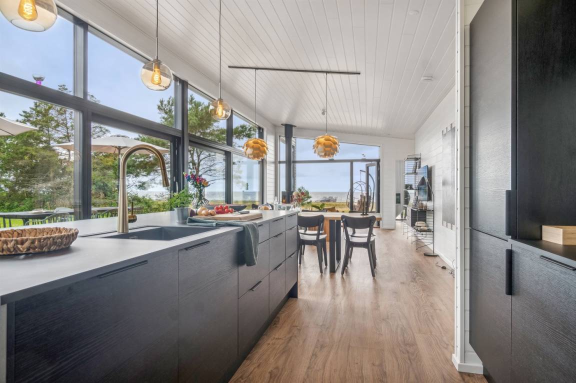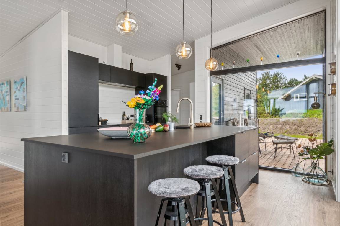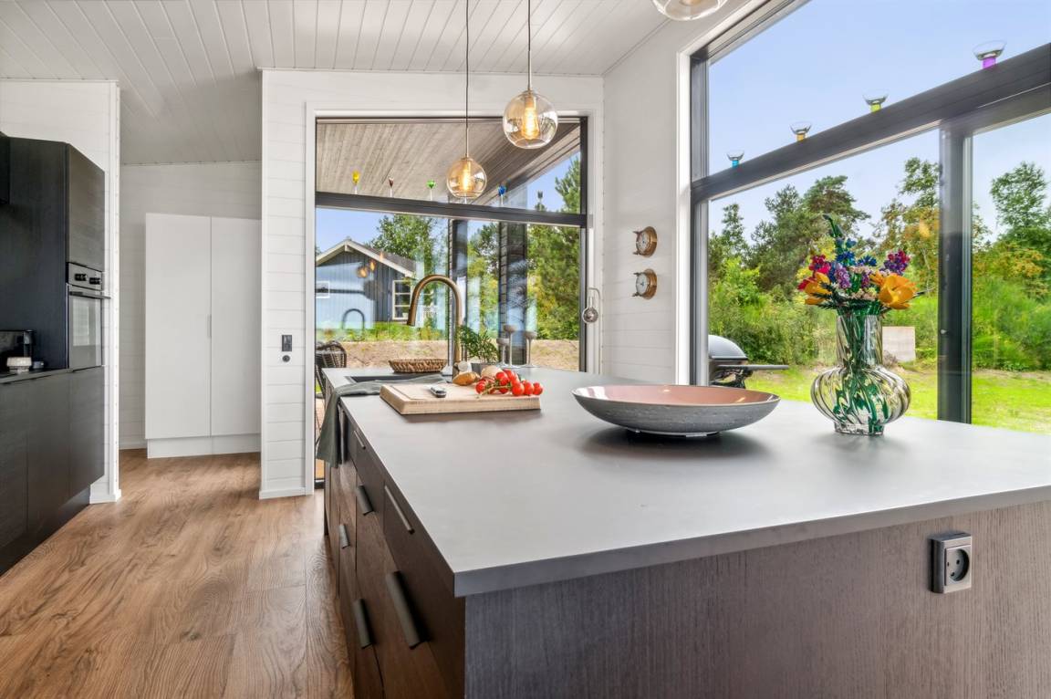 Das Haus befindet sich auf einem schönen Naturgrundstück mit Panoramablick vom Haus und von der großen Terrasse mit ganzjährig nutzbarer Außendusche und überdachten Terrassen sowohl nach Norden als auch nach Süden, wo du die Sonne genießen oder Schatten und Schutz finden kannst. Der zentrale Treffpunkt des Hauses ist der große, moderne Küchenbereich mit Kochinsel, der direkt mit dem Wohnzimmer verbunden ist und Schiebetüren zur Terrasse hat, die das Innen- und Außenbereich auf vorbildliche Weise verbinden.