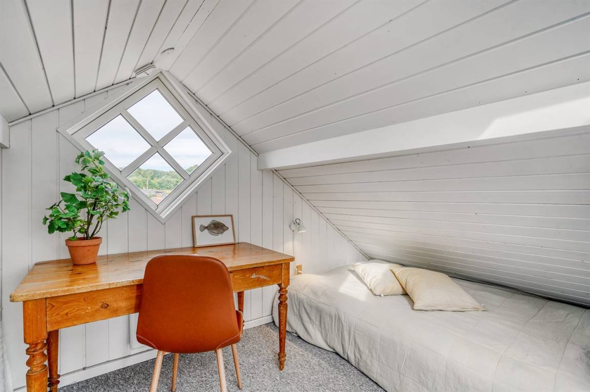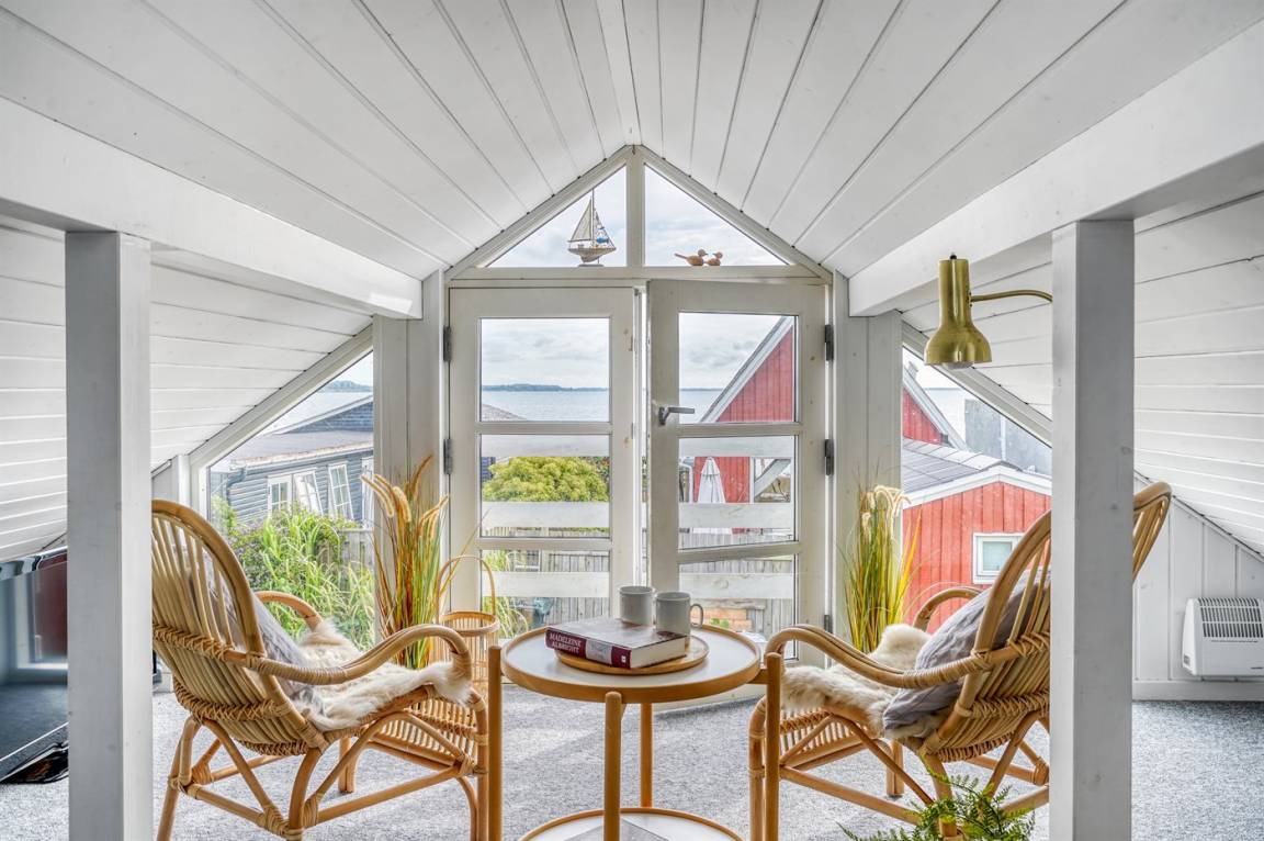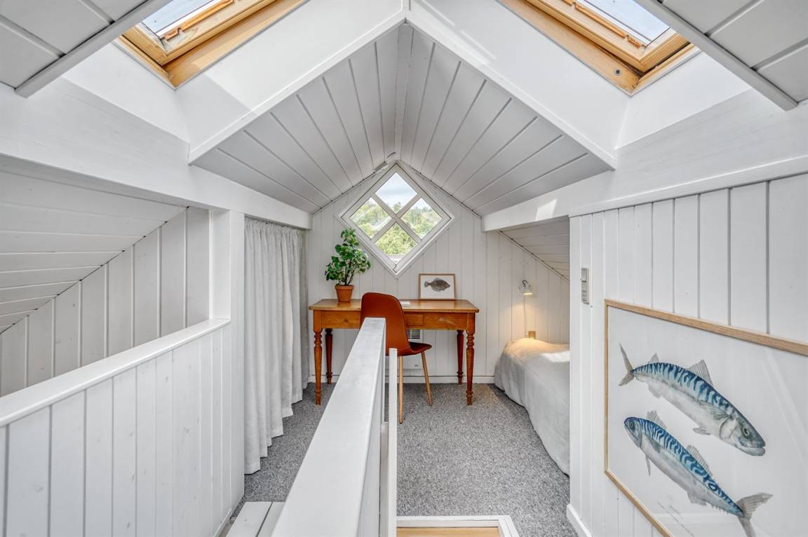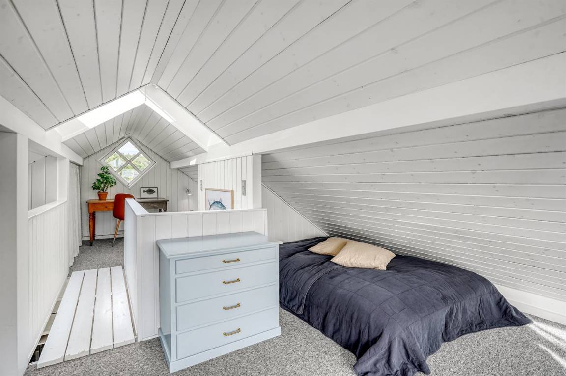 Von dem gemütlichen und einladenden Obergeschoss aus hast du einen schönen Meerblick. Hier können vier Personen schlafen – die Schlafplätze verteilen sich auf zwei alkovenartige Schlafbereiche mit guten Matratzen auf Rädern, die sich ganz nach Bedarf leicht umstellen lassen.