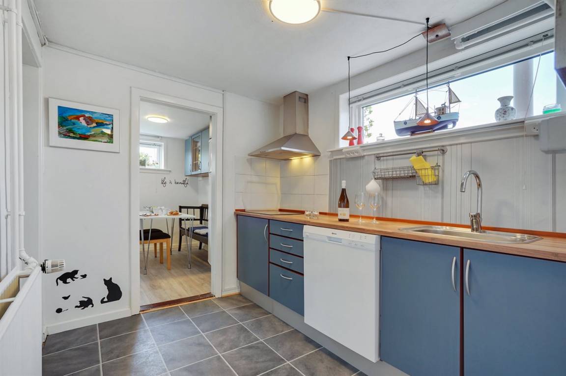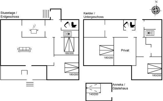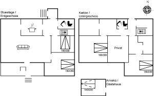 Im Erdgeschoss gibt es einen Windfang, einen Flur, ein Wohnzimmer, eine Küche, ein Badezimmer mit Toilette und Duschnische, ein Zimmer mit Doppelbett und ein Zimmer mit 2 Einzelbetten. Es gibt einen Kaminofen. Kühl- und Gefrierschrank, 4 Induktions-Kochplatten, Umluftofen sowie eine Geschirrspülmaschine. TV und Wi-Fi.