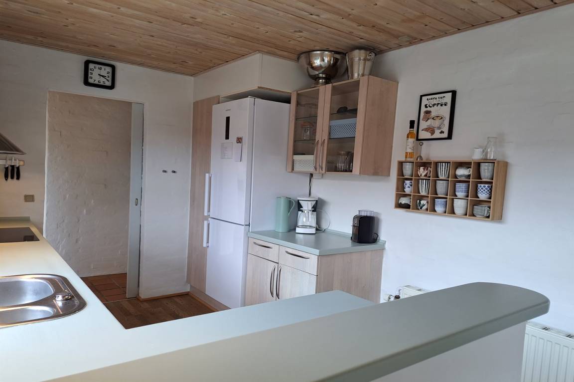 Die Küche ist mit Kühlschrank ausgestattet. Außerdem gibt es 4 Induktions-Kochzonen, Umluftofen, Mikrowelle sowie Geschirrspüler.