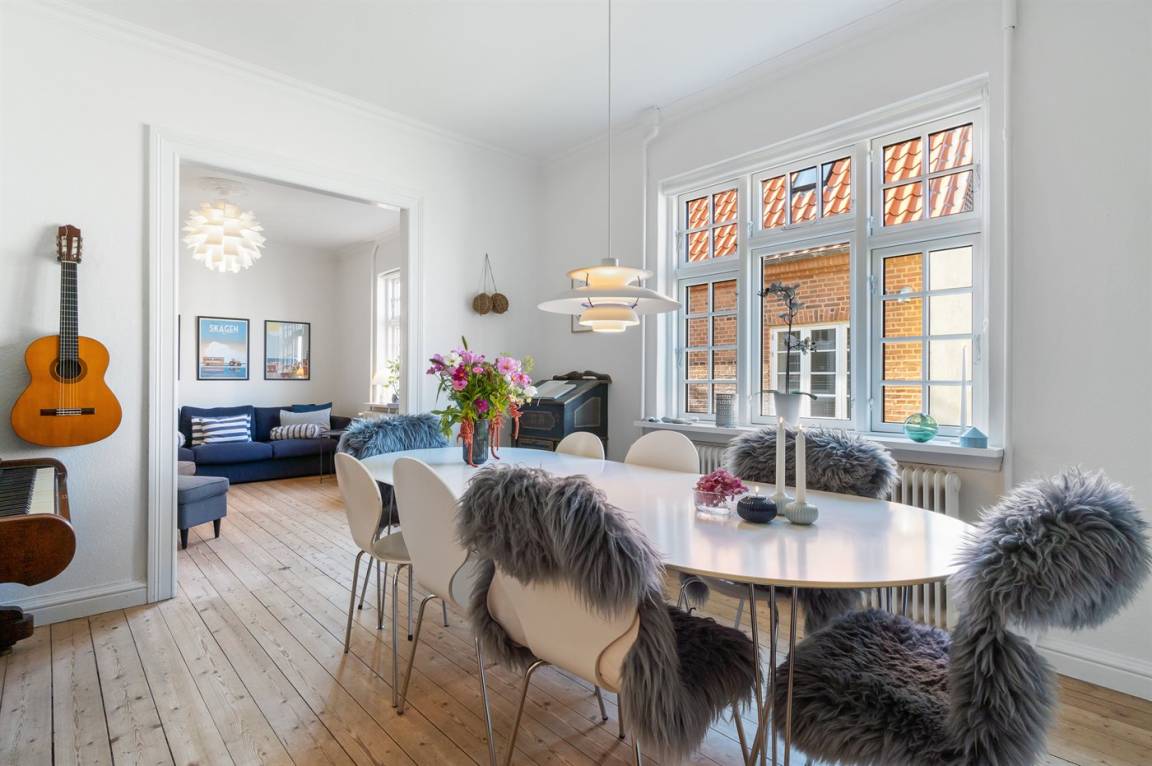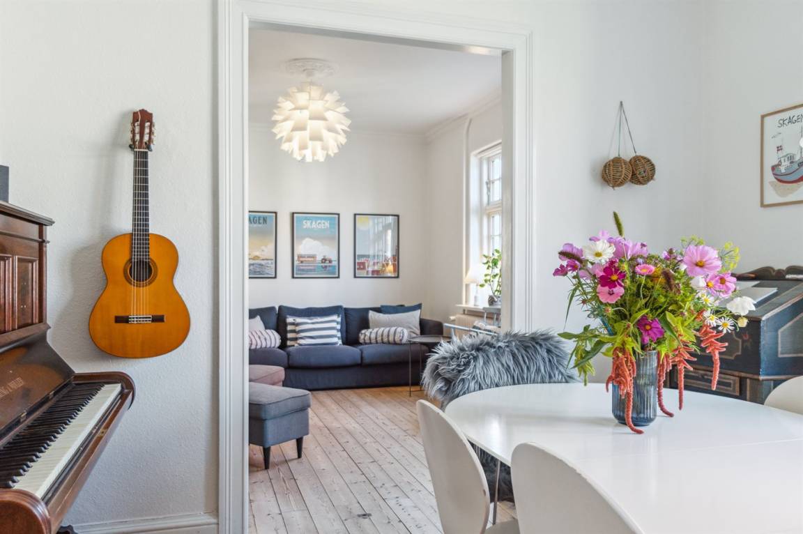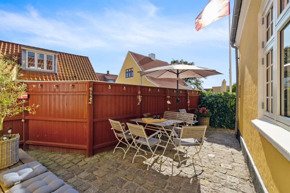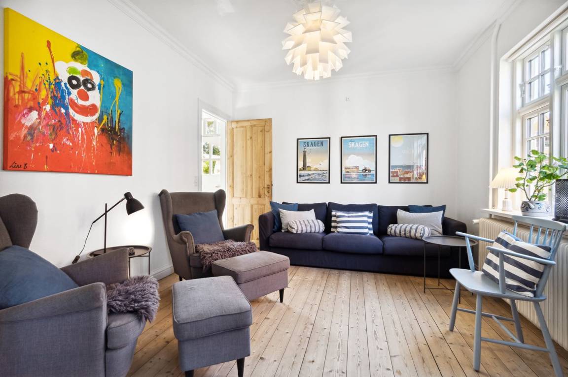 Gemütliches Skagenhaus mit einer charmanten Einrichtung im ursprünglichen Stil. Das Haus liegt zentral in Skagen auf einem kleinen Grundstück mit Terrasse und gemütlicher Ecke am Ende Einer Sackgasse.