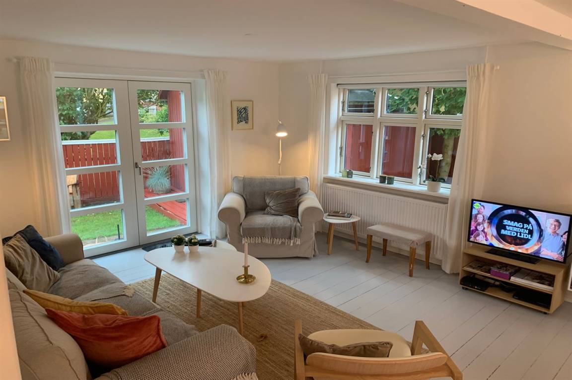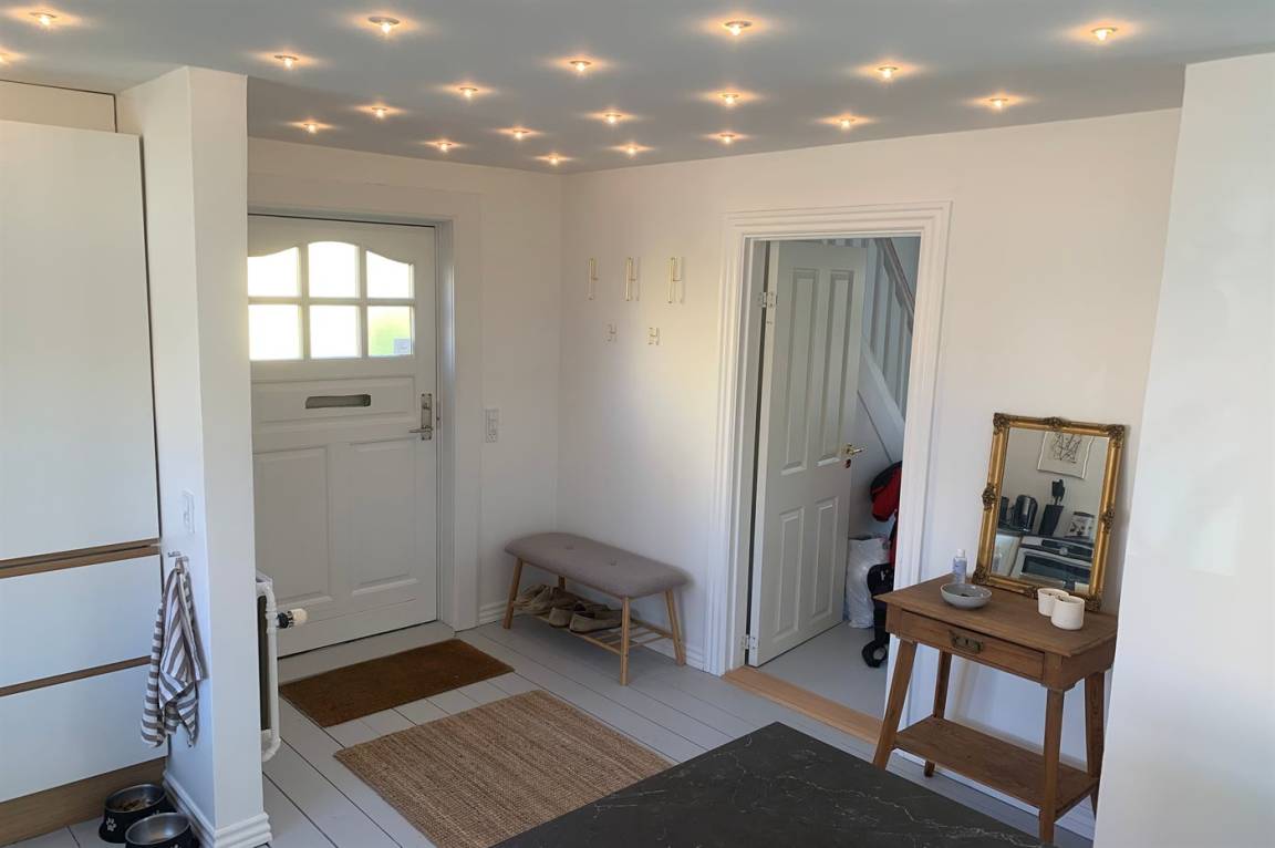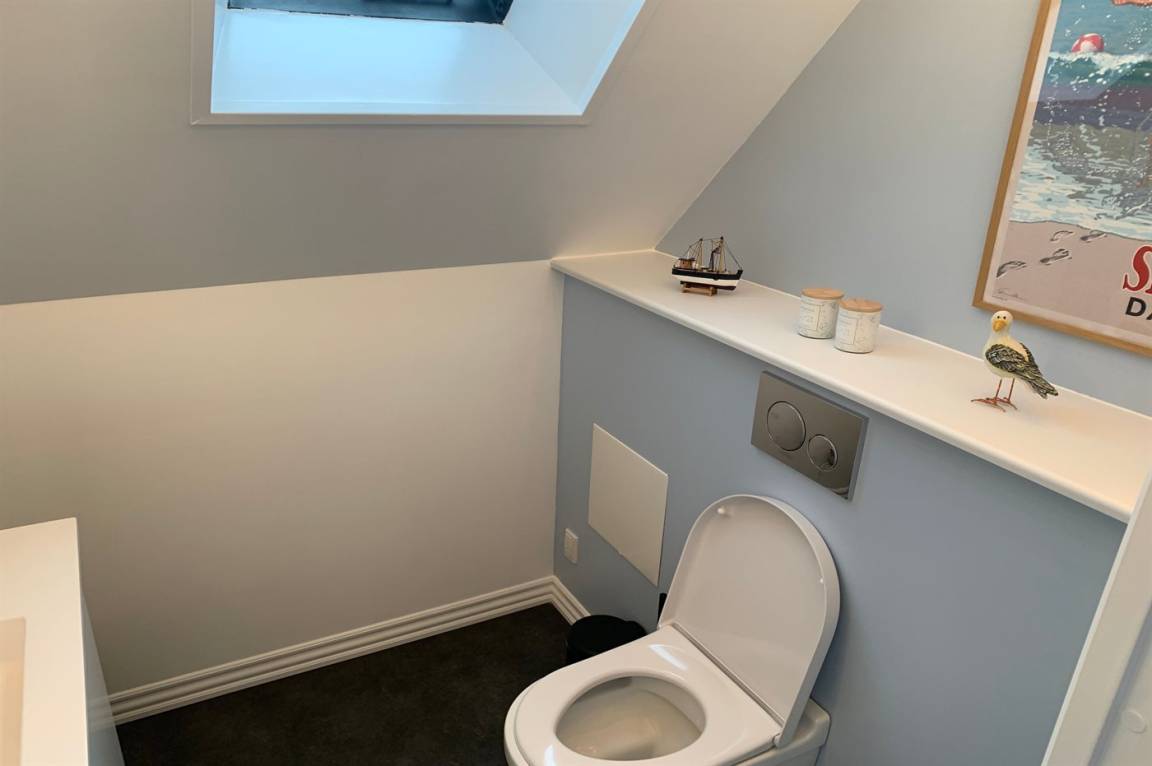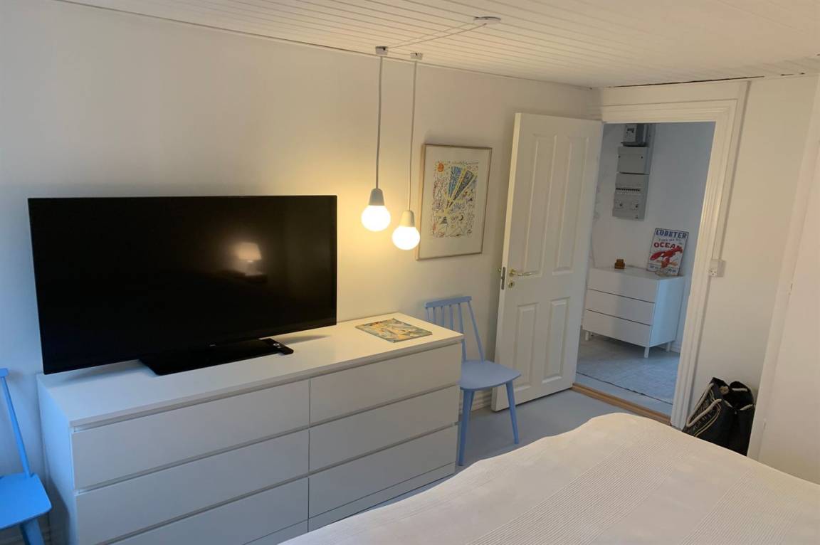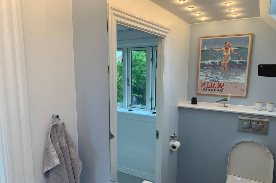 Im Erdgeschoss befindet sich ein Badezimmer mit Duschen und Toilette, im 1. Stock befindet sich eine Toilette. Im Wohnzimmer steht ein Fernseher mit Dongle, Disney+, ViaPlay und Netflix-Zugang zur Verfügung, auf dem Sie dänische, schwedische, norwegische und 5 deutsche Sender empfangen können. Außerdem steht DVD-/BlueRay-Player zur Verfügung.