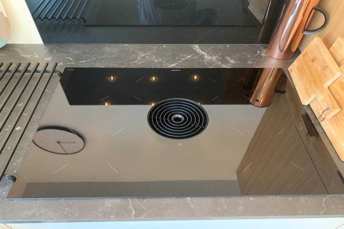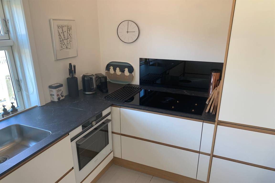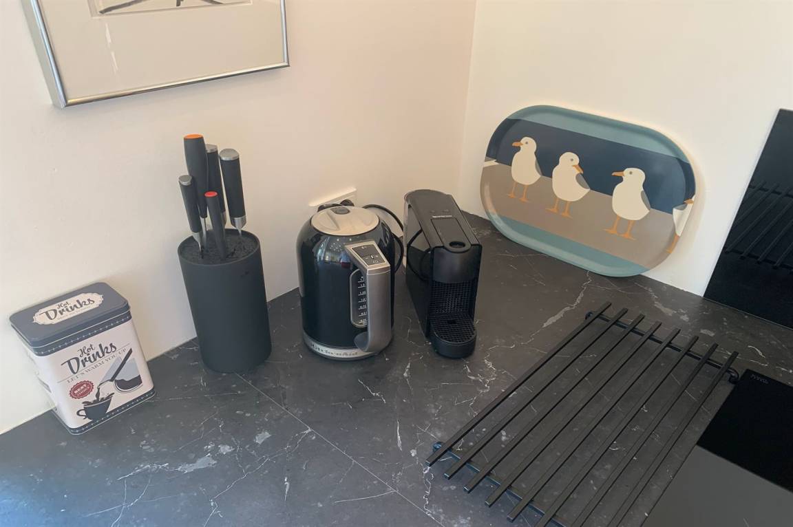 Die neu eingerichtete Küche ist mit einem Kühl-/Gefrierschrank ausgestattet. 4 Induktionskochplatten mit integrierter Dunstabzugshaube. Backofen. Spülmaschine. Kaffeemaschine, Wasserkocher und Nespresso-Maschine.