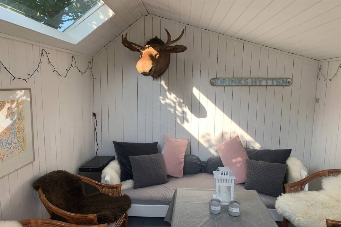 Wenn es draußen feucht oder regnerisch ist, bietet sich die „Drinks-Hütte" an. In einem der Gästehäuser befindet sich ein gemütlicher Loungebereich mit Liege- und Sitzgelegenheiten, wo Sie Ihre Drinks genießen können. Es gibt einen Weinkühlschrank zum Kühlen von Champagner und Roséwein.