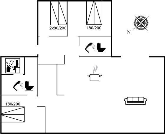 Das Haus wird mit einer Luft-Wasser-Wärmepumpe beheizt und verfügt über Fußbodenheizung in allen Räumen. Es gibt sieben Schlafplätze, verteilt auf drei Schlafzimmer. Zwei Badezimmer mit Dusche sowie eine Sauna stehen dir zur Verfügung.