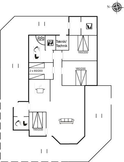 DraußenDie Ferienunterkunft liegt auf einem 1400 m² großen Dünengrundstück. Die Entfernung zum Meer beträgt 400 m. Die nächste Einkaufsmöglichkeit liegt 1500 m entfernt. Es steht ein 60 m² Terrassenareal zur Verfügung. Davon insgesamt 30 m² geschlossene Terrasse. Geräteraum. Schaukel. Sandkasten. Parkplatz auf dem Grundstück.