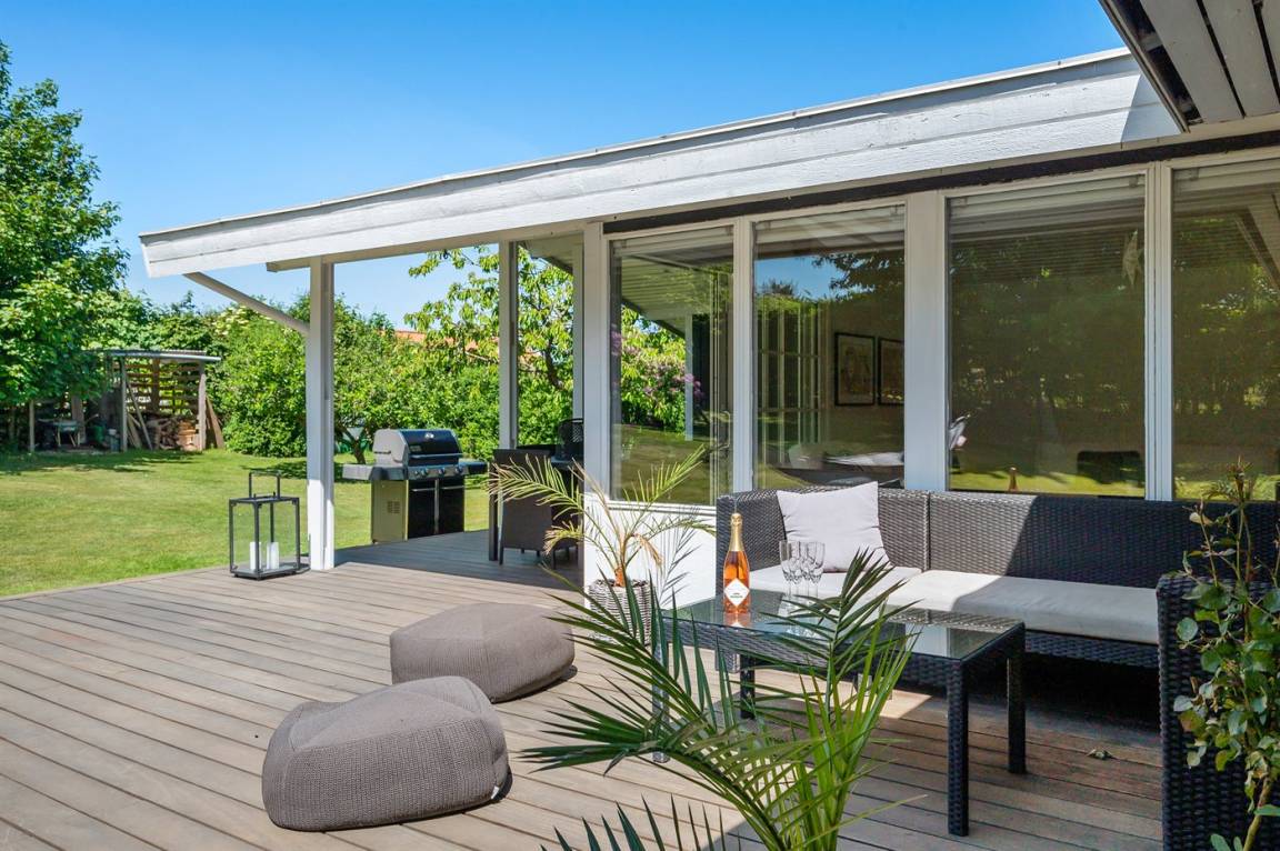 Die Ferienunterkunft liegt auf einem 1214 m² großen Grundstück mit Sonne, Schatten und schönen windgeschützten Bereichen. Herrliche überdachte Terrasse (15 m²) mit Essplatz und 80 m² große Holzterrasse mit Loungemöbeln. In der Einfahrt ist Platz für 2 Autos.