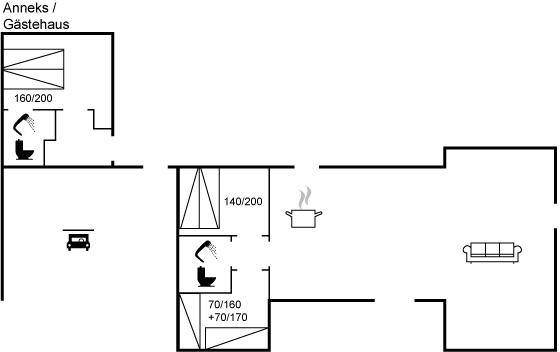 SchlafverhältnisseDie Schlafplätze verteilen sich auf 3 Schlafräume. 4 Schlafplätze in Doppelbetten. 2 Schlafplätze in Einzelbetten. 2 von diesen Schlafplätzen befinden sich im Gästehaus.