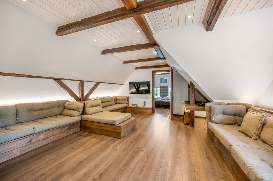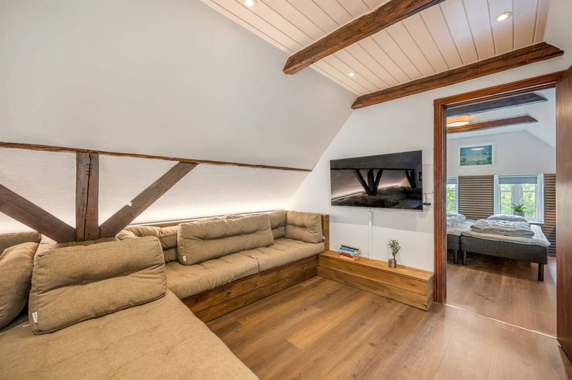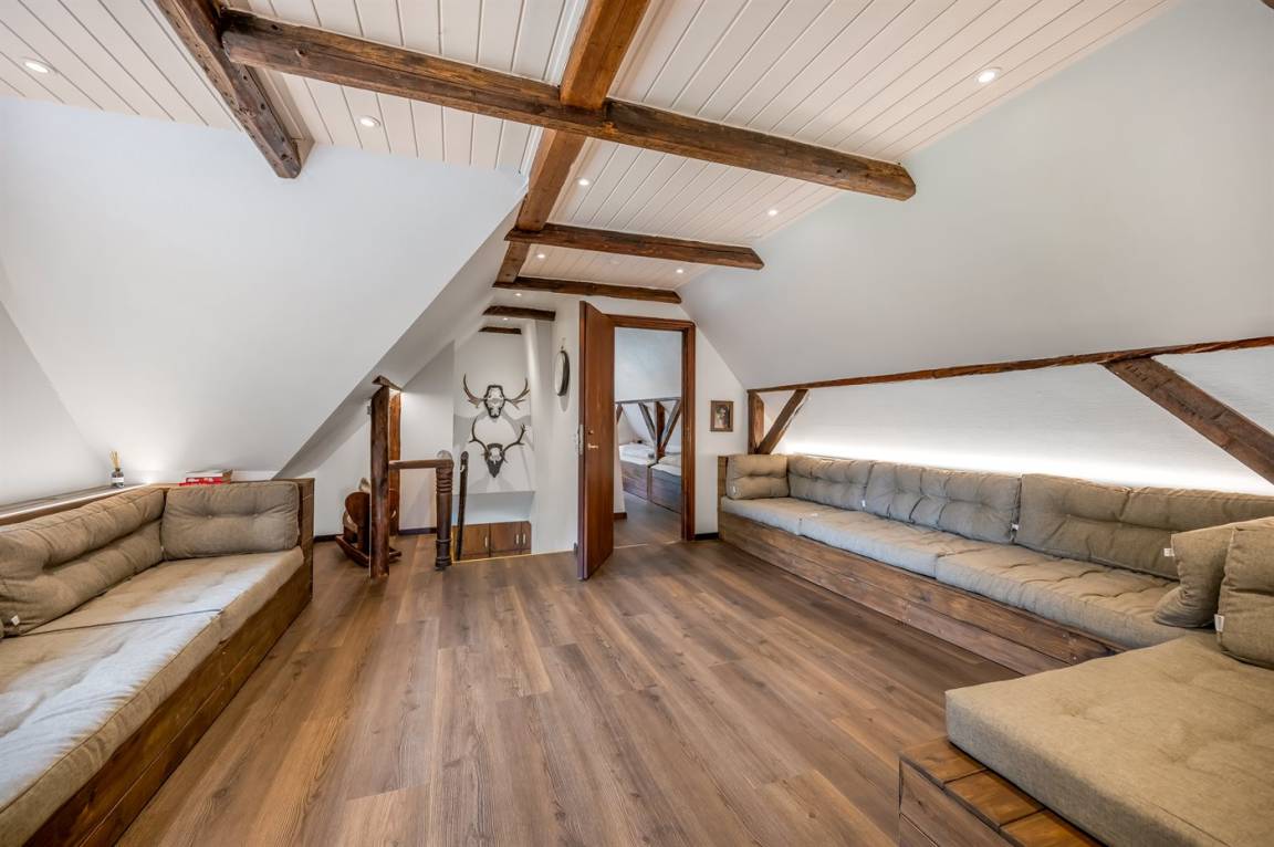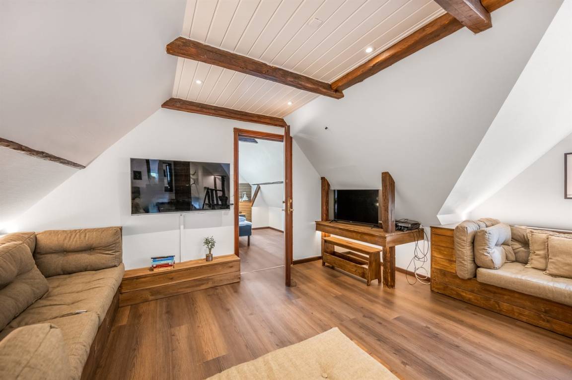 Im Obergeschoss befindet sich ein gemütlicher Loungebereich mit TV und PlayStation, wo Kinder und Erwachsene gemeinsam entspannen und Spaß haben können.
