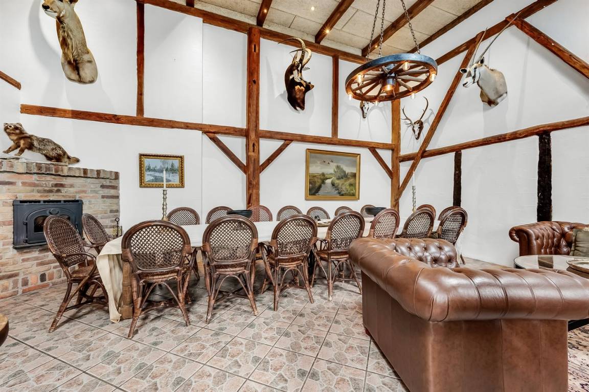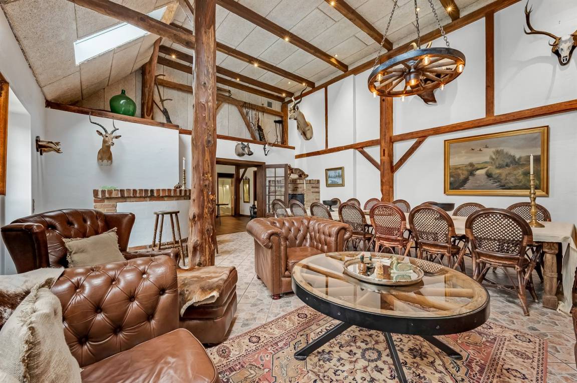 Die Jagdstube des Hauses ist mit einem Essbereich für 18 Personen eingerichtet und lädt zu gemütlichen Stunden ein. Mit freiliegenden Balken, rustikalen Stützpfeilern, einem Kachelofen und einer Bar versprüht der Raum echtes Jagdhütten-Flair.