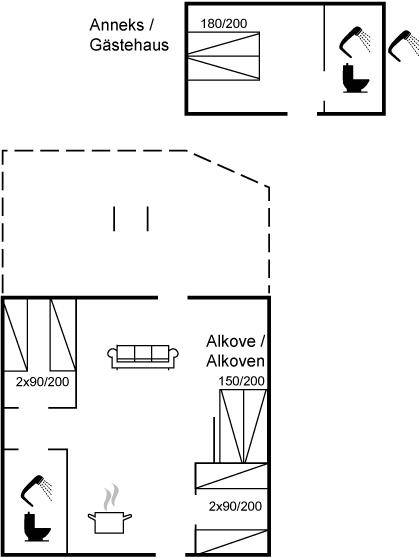 SchlafverhältnisseDie Schlafplätze verteilen sich auf 4 Schlafräume. 2 Schlafplätze in einem Doppelbett. 4 Schlafplätze in Einzelbetten.2 Schlafplätze im Alkoven. 2 von diesen Schlafplätzen befinden sich im Wohnzimmer des Ferienhauses, und 2 Schlafplätzen befinden sich im Gästehaus.
