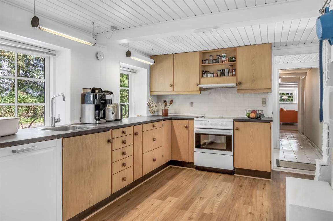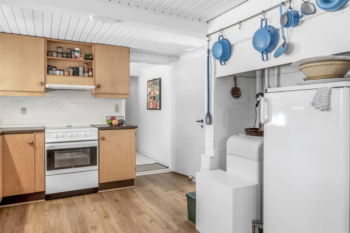 Die Küche ist mit E-Herd, Kühlschrank und Geschirrspüler ausgestattet. Im hinteren Teil des Hauses gibt es Gefrierschrank (60L) Waschmaschine und Wäschetrockner.