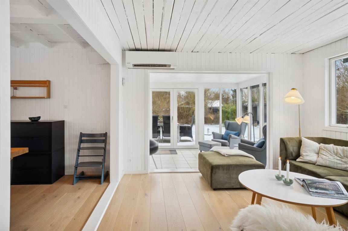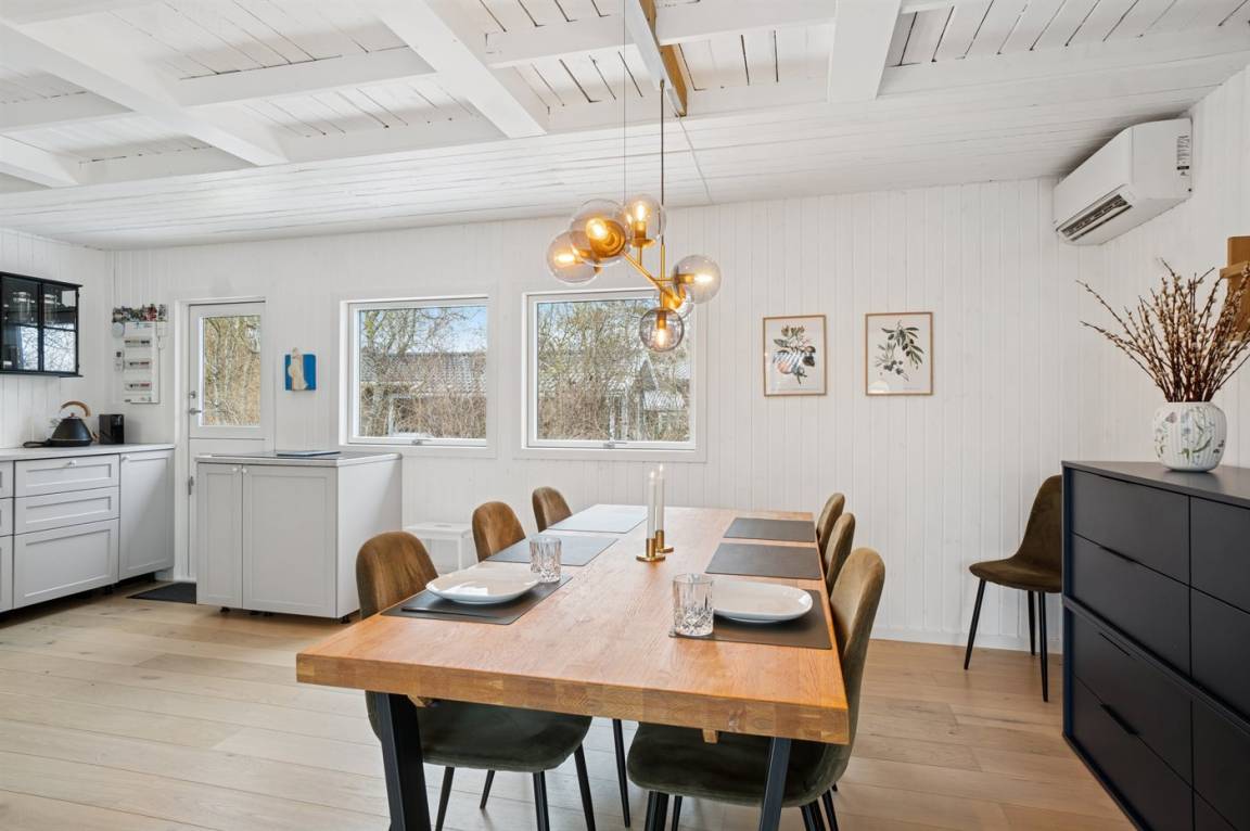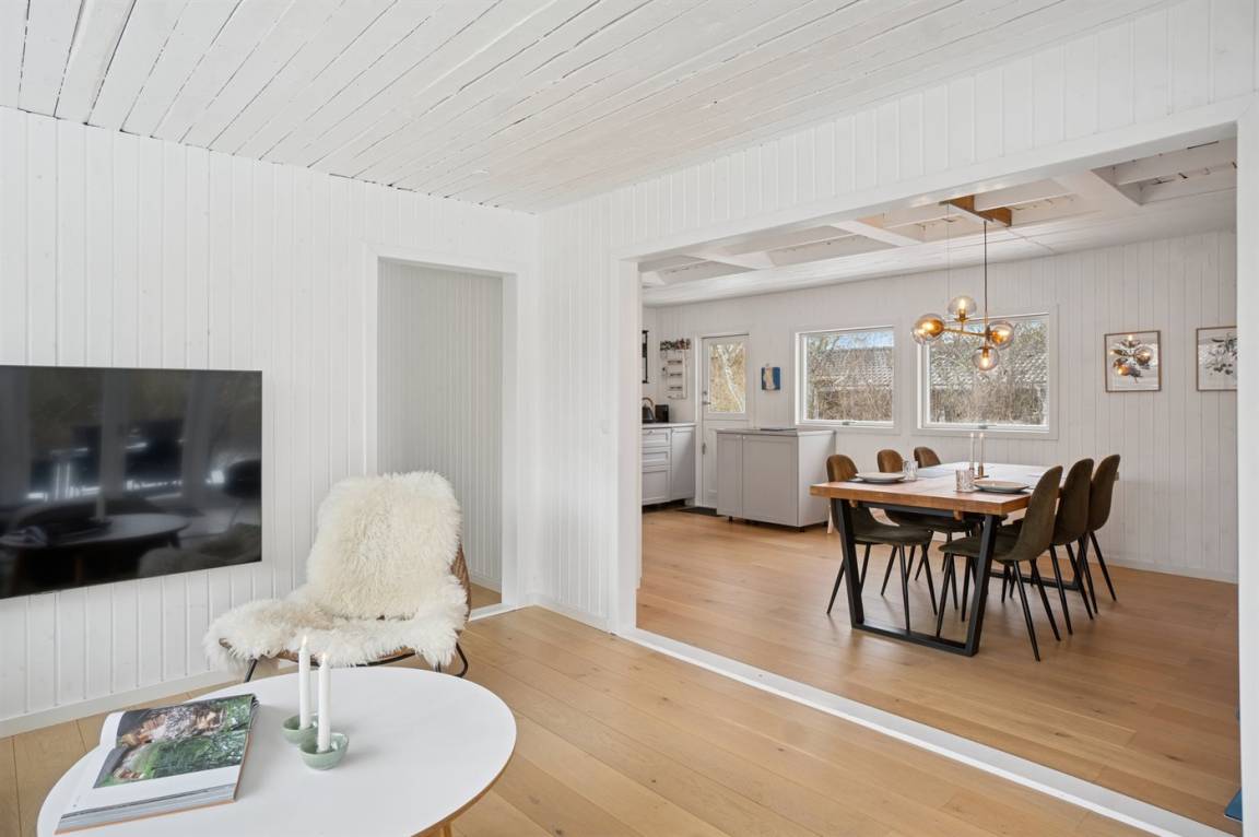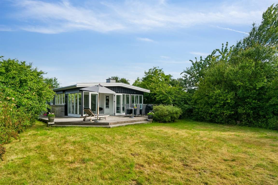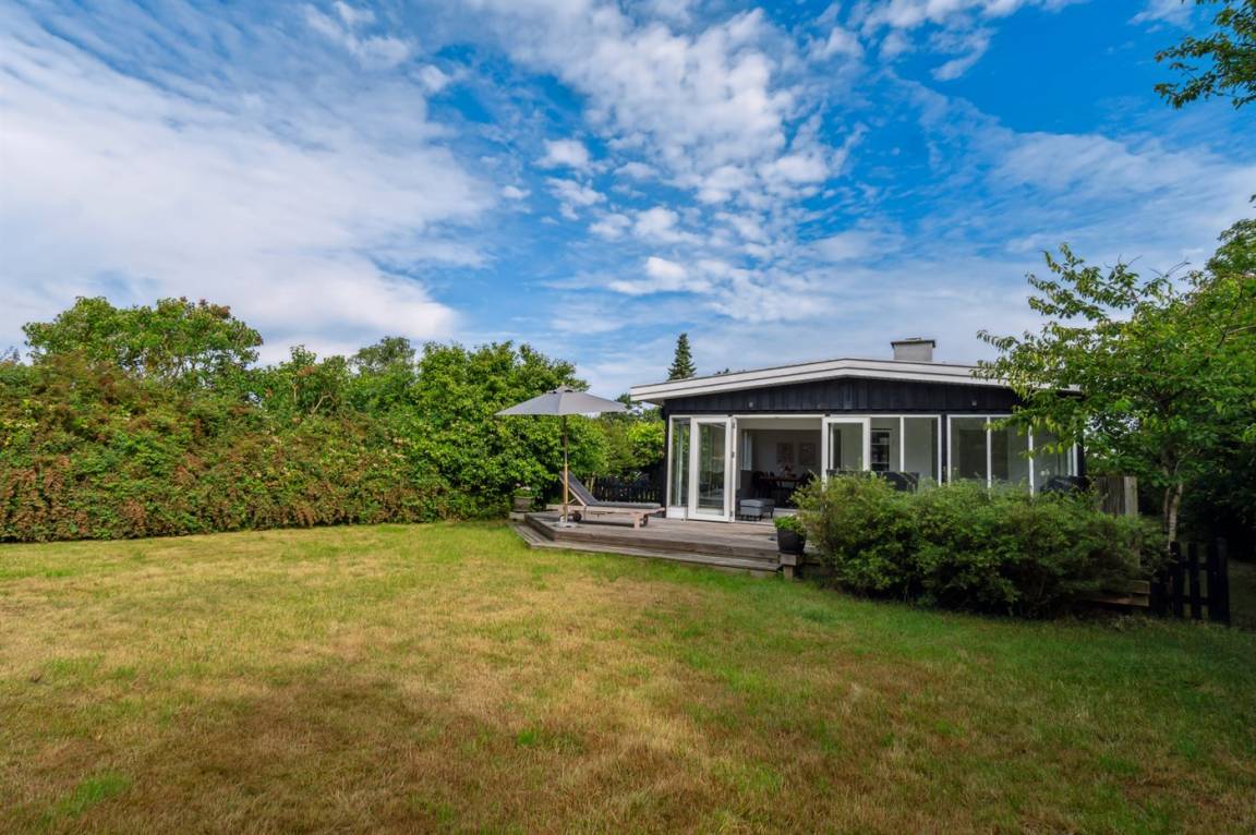 Dieses sommerlich eingerichtete und komplett renovierte Ferienhaus liegt in einer ruhigen Gegend, nur 250 Meter von einem guten und kinderfreundlichen Badestrand entfernt. Das Haus wurde 2022 renoviert und mit viel Lichteinfall ist es überall hell und angenehm zu verweilen. Die moderne Küche ist offen mit dem Fernsehzimmer und dem Essbereich verbunden, von wo aus man in ein fantastisches Wohnzimmer mit dem schönsten Licht gelangt, wo man sich eins mit den Bäumen, Büschen und der Natur draußen fühlt. Von hier aus hat man Zugang zu einer großen, südlich ausgerichteten Holzterrasse und zum Garten, wo die Kinder spielen können.