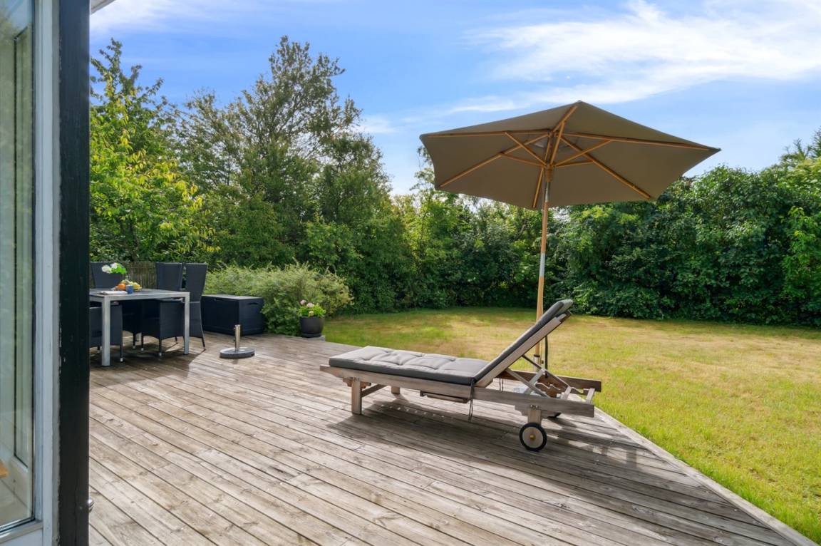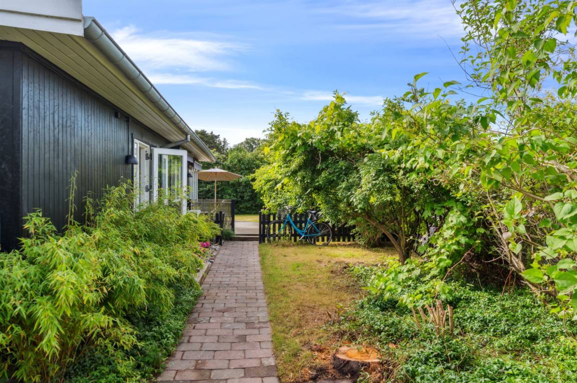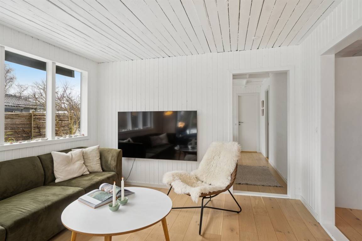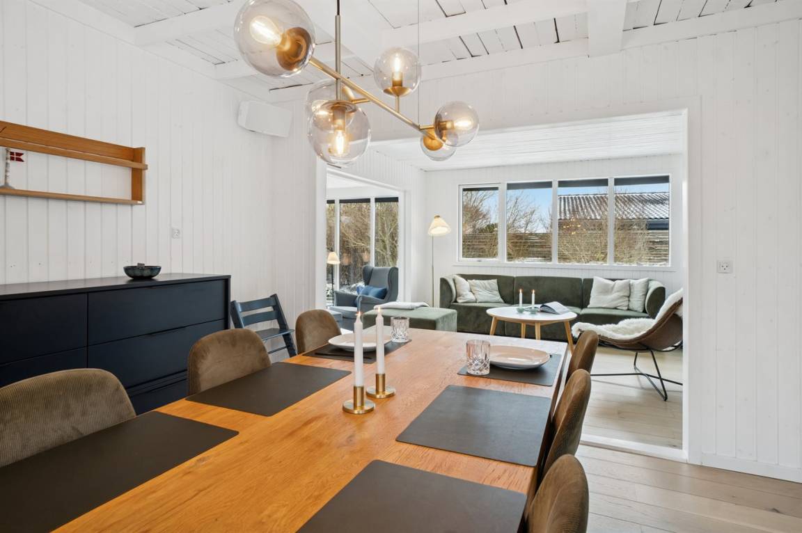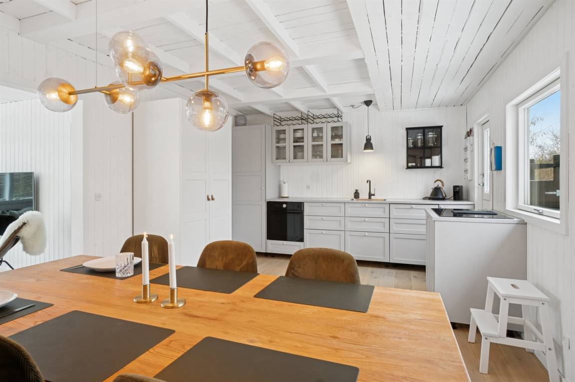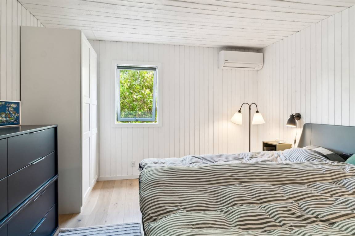 Dieses sommerlich eingerichtete und komplett renovierte Ferienhaus liegt in einer ruhigen Gegend, nur 250 Meter von einem guten und kinderfreundlichen Badestrand entfernt. Das Haus wurde 2022 renoviert und mit viel Lichteinfall ist es überall hell und angenehm zu verweilen. Die moderne Küche ist offen mit dem Fernsehzimmer und dem Essbereich verbunden, von wo aus man in ein fantastisches Wohnzimmer mit dem schönsten Licht gelangt, wo man sich eins mit den Bäumen, Büschen und der Natur draußen fühlt. Von hier aus hat man Zugang zu einer großen, südlich ausgerichteten Holzterrasse und zum Garten, wo die Kinder spielen können.