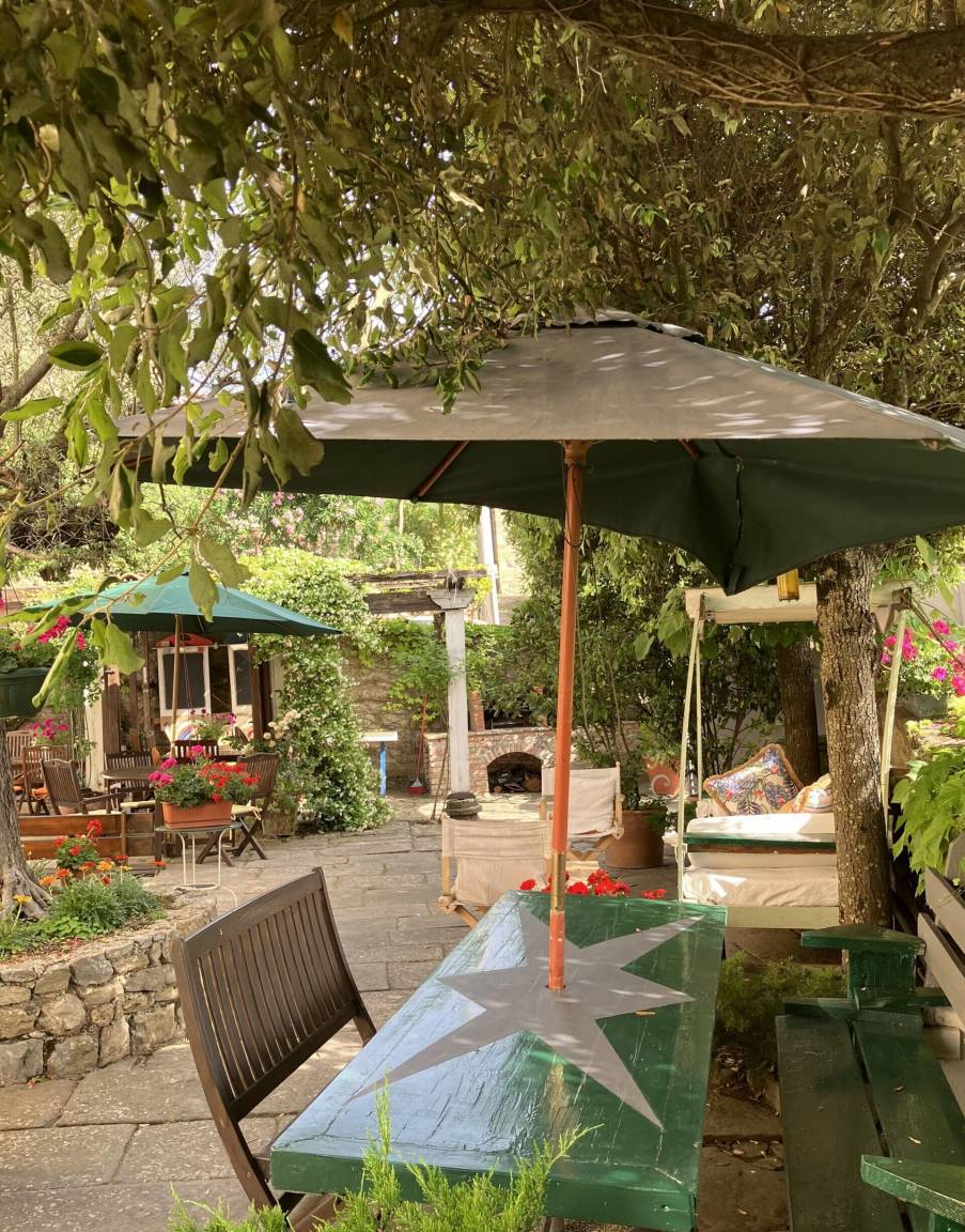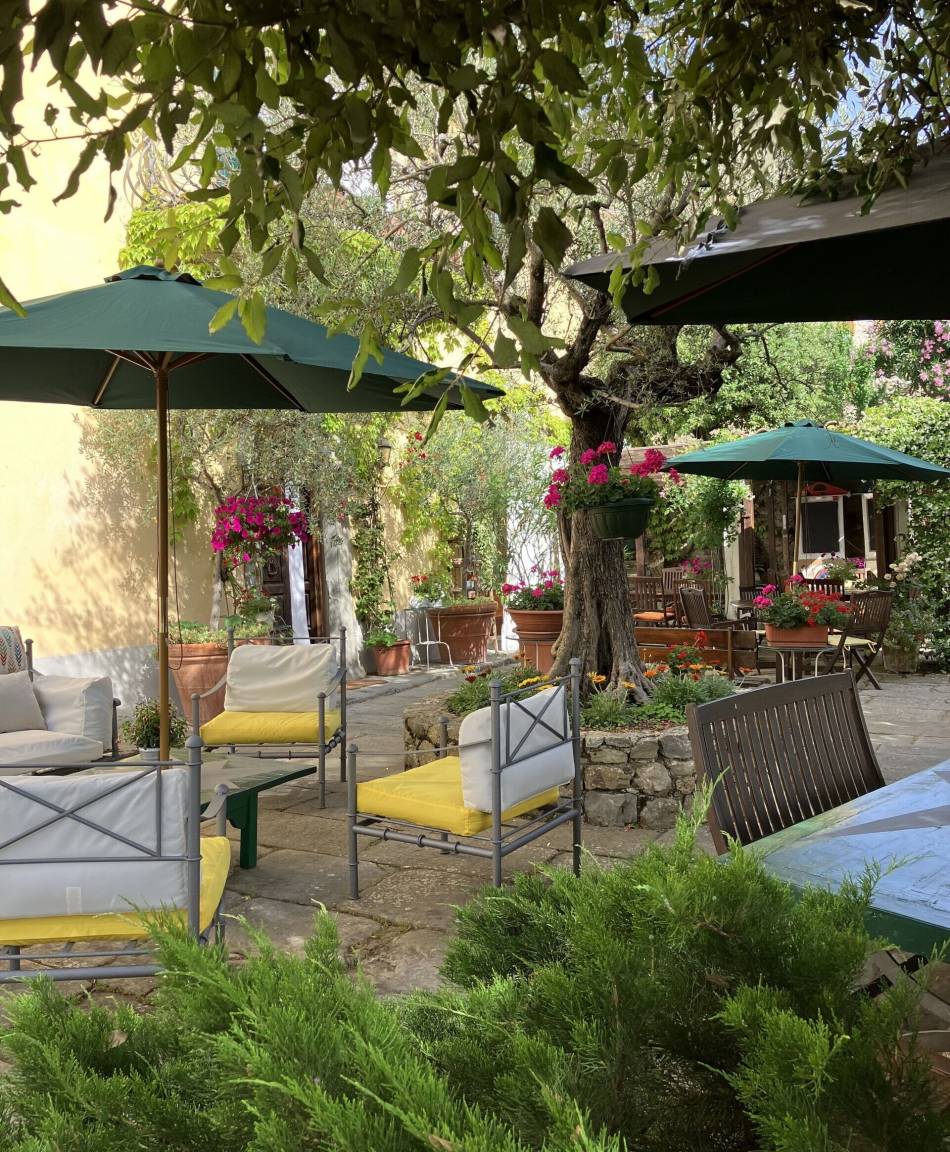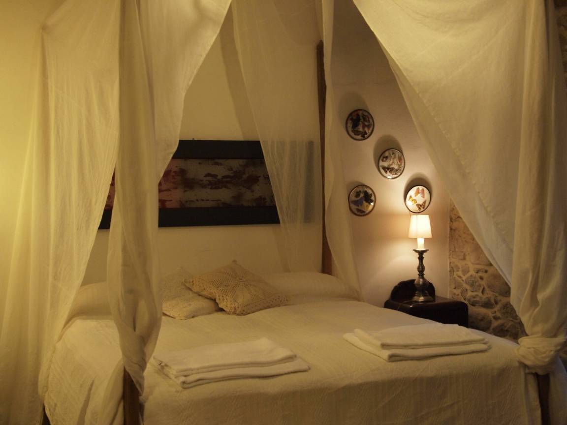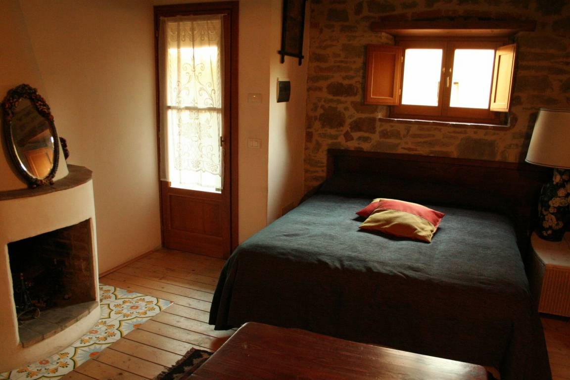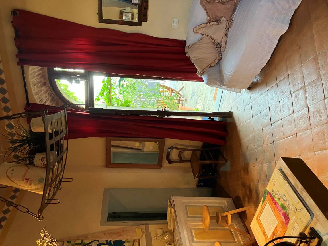 Schlafzimmer mit Bad 1 (25 m²): Doppelbett, WiFi Internet, Klimaanlage, tragbarer Ventilator, Sessel, Schreibtisch, Kamin, Kühlschrank, WC, Bidet, Dusche, Fön, Ausgang auf den Patio.