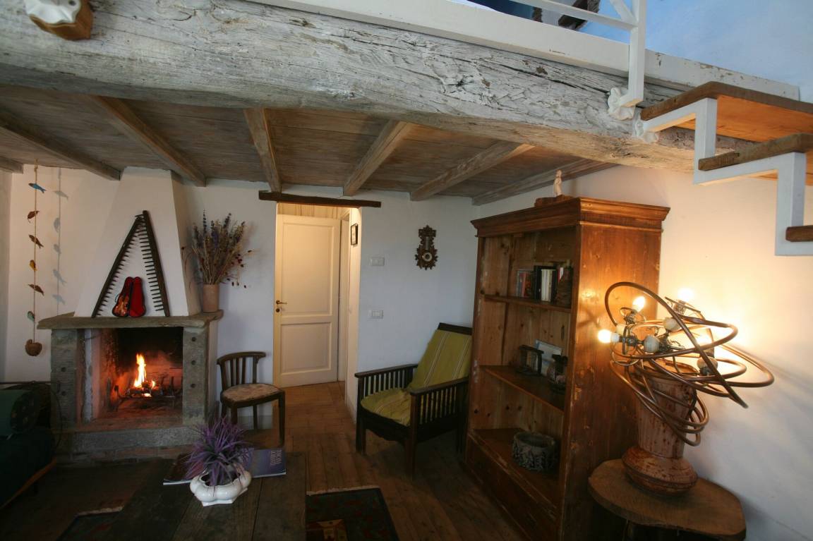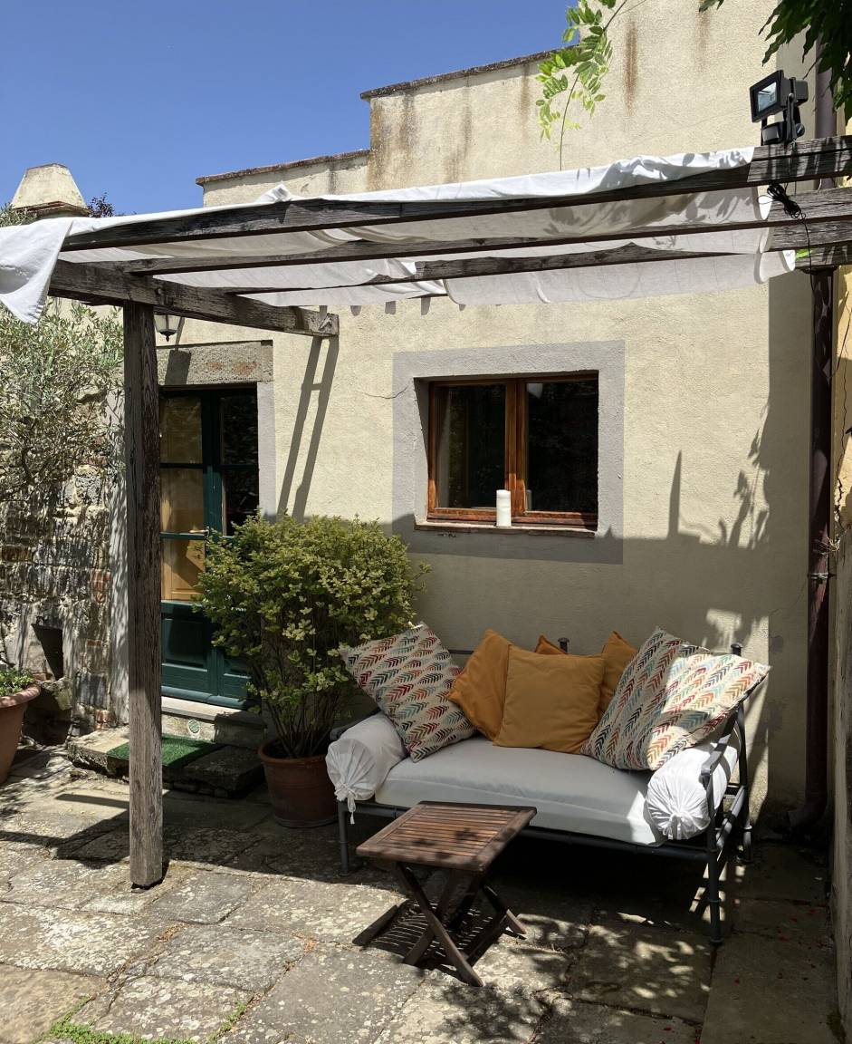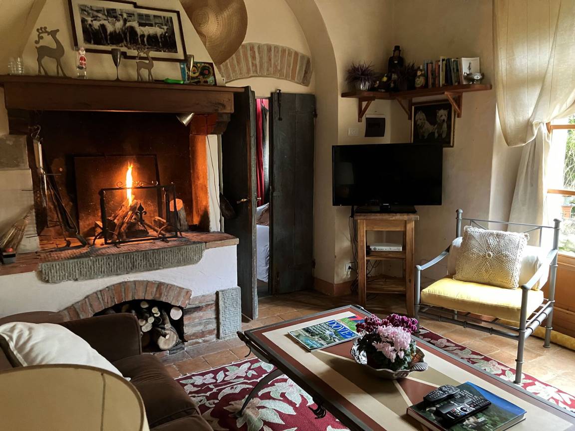 Wohnzimmer (15 m²): zwei Sofas, Kamin, WiFi Internet, Satelliten-TV, tragbarer Ventilator, Ausgang auf den Patio.