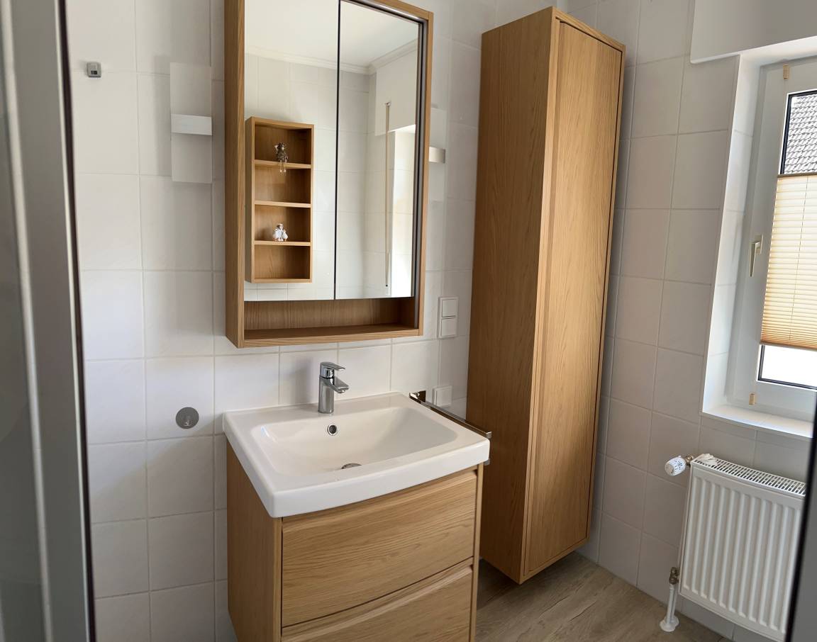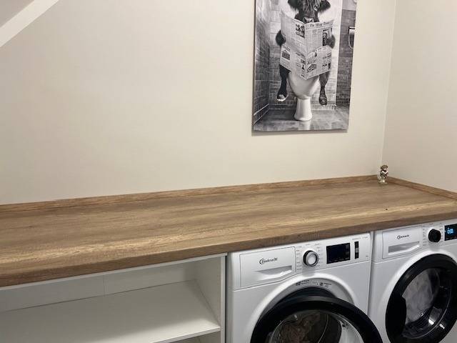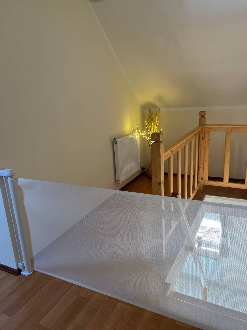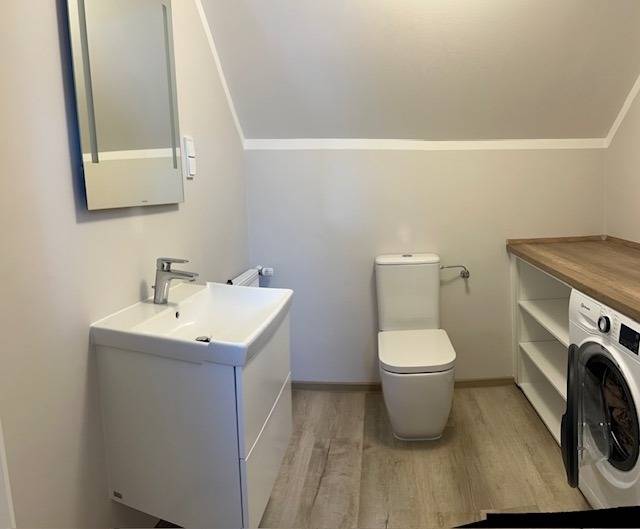Im Obergeschoss finden Sie einen hellen Flur, ein weiteres modernes Badezimmer mit WC, ausgestattet mit Waschmaschine und Trockner, sowie ein weiteres gemütliches Schlafzimmer mit Doppelbett und einem komfortablen Schlafsessel - ideal für erholsame Nächte.