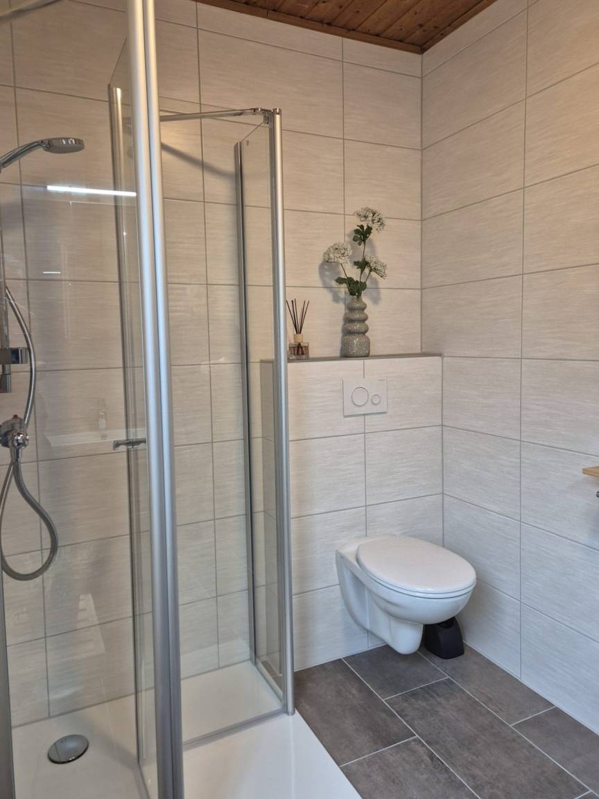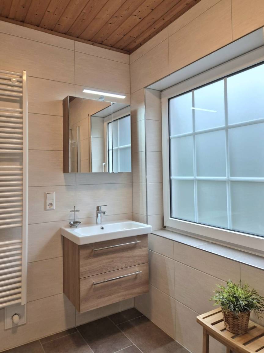 Im Obergeschoss finden Sie ein weiteres Badezimmer mit Dusche und WC, ein Doppelzimmer und ein Zweibettzimmer.