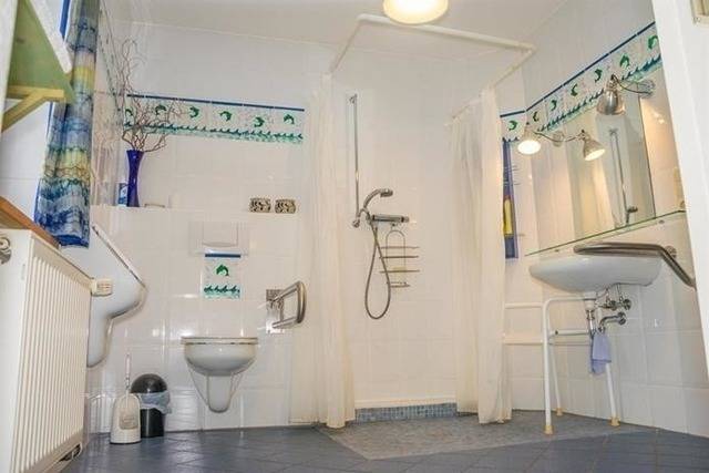 Im Erdgeschoss befinden sich ein Doppelzimmer mit erhöhten Betten sowie ein barrierefreies Badezimmer mit Dusche und Waschbecken. Ein offenes Wohnzimmer mit voll ausgestatteter Küche lädt zum Verweilen ein.