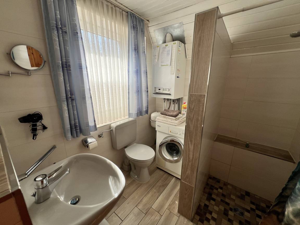 Tauchen Sie ein in eine liebevoll gestaltete Unterkunft, die Ihnen alles bietet, was Sie für einen unvergesslichen Aufenthalt benötigen. Im Erdgeschoss erwartet Sie eine voll ausgestattete Küche mit separater Essecke, wo Sie Ihre Mahlzeiten zubereiten und in gemütlicher Atmosphäre genießen können. Der einladende Wohnbereich lädt zum Verweilen ein, während das Badezimmer mit Dusche und WC für Ihren Komfort sorgt.