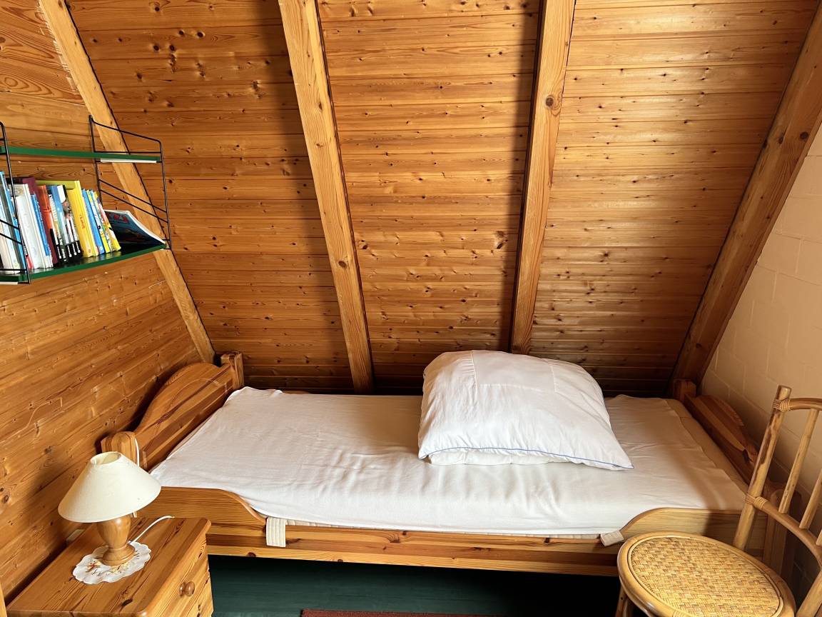 Im Obergeschoss finden Sie ein Schlafzimmer mit Doppelbett sowie ein weiteres Schlafzimmer mit zwei Betten und einem Kinderbett, perfekt für Familienausflüge oder gemeinsame Erlebnisse mit Ihrer Familie.